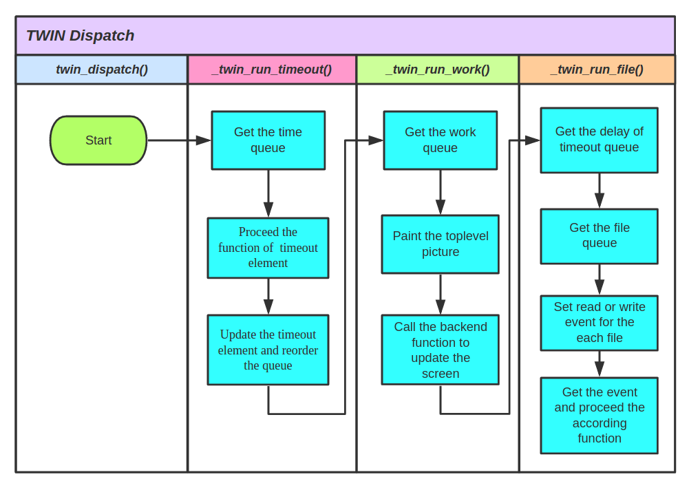 twin_dispatch()函式中只有一個包含三個函式的迴圈:_twin_run_timeout()_time_run_work()_twin_run_file():用於監測外部滑鼠等活動,尚未實作;