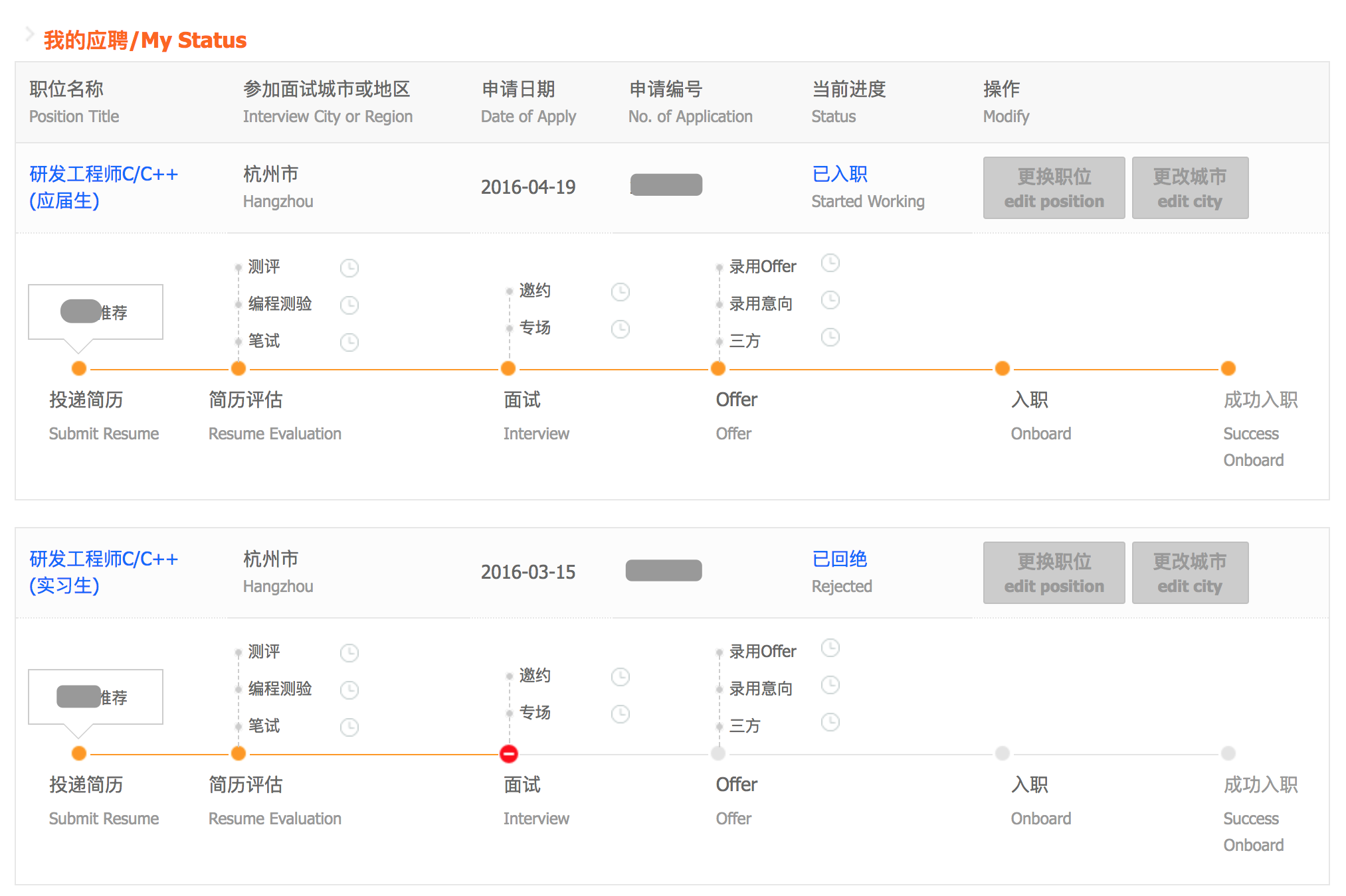 整个面试的过程还是不错的,面试官都很专业,上来直接询问技术相关的问题,并且会有意识的引导,态度也都比较和善,是我个人认可的面试方式。面试完后,阿里校招系统上的信息更新也非常及时,不得不夸一下这个招聘系统很专业,大大提升了面试者对这家公司的信心与好感度。当时唯一觉得不爽的就是不知道面试电话什么时候会来,除了一位面试官提前电邮与我预约时间外,其他面试都是时间未知,我只好抱着海外漫游的电信手机一直等,度过了难熬的一个多月时光。
