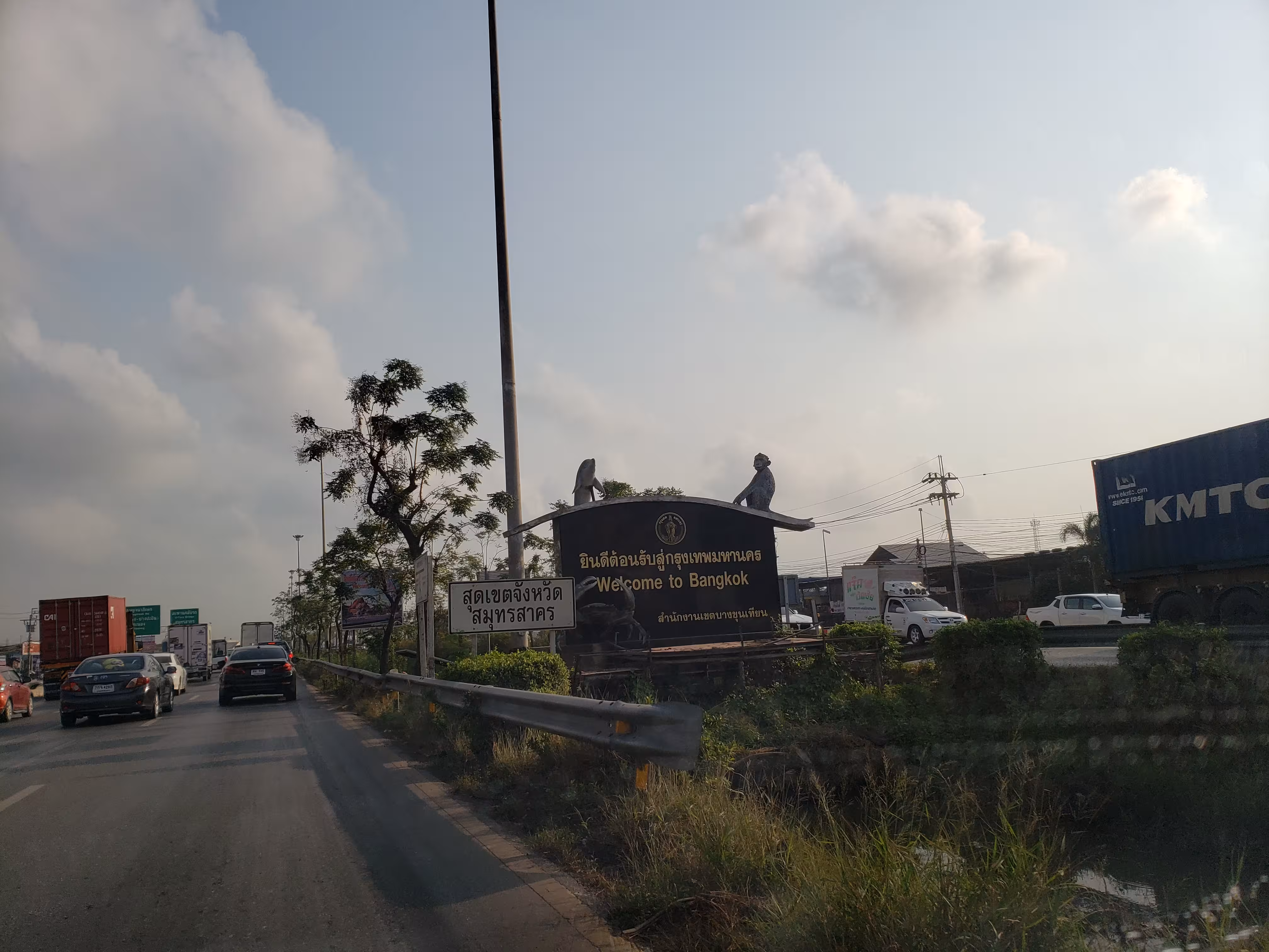 七点起来收拾一下,退房,取回一千泰铢的押金,便踏上返程之路。回曼谷的前半段非常顺畅,当然我也喜欢开快车(咦),到达曼谷周边才八点半左右。曼谷车多已是常识,碰上早高峰,开始走走停停,恰好有机会拍到曼谷交界的欢迎碑。