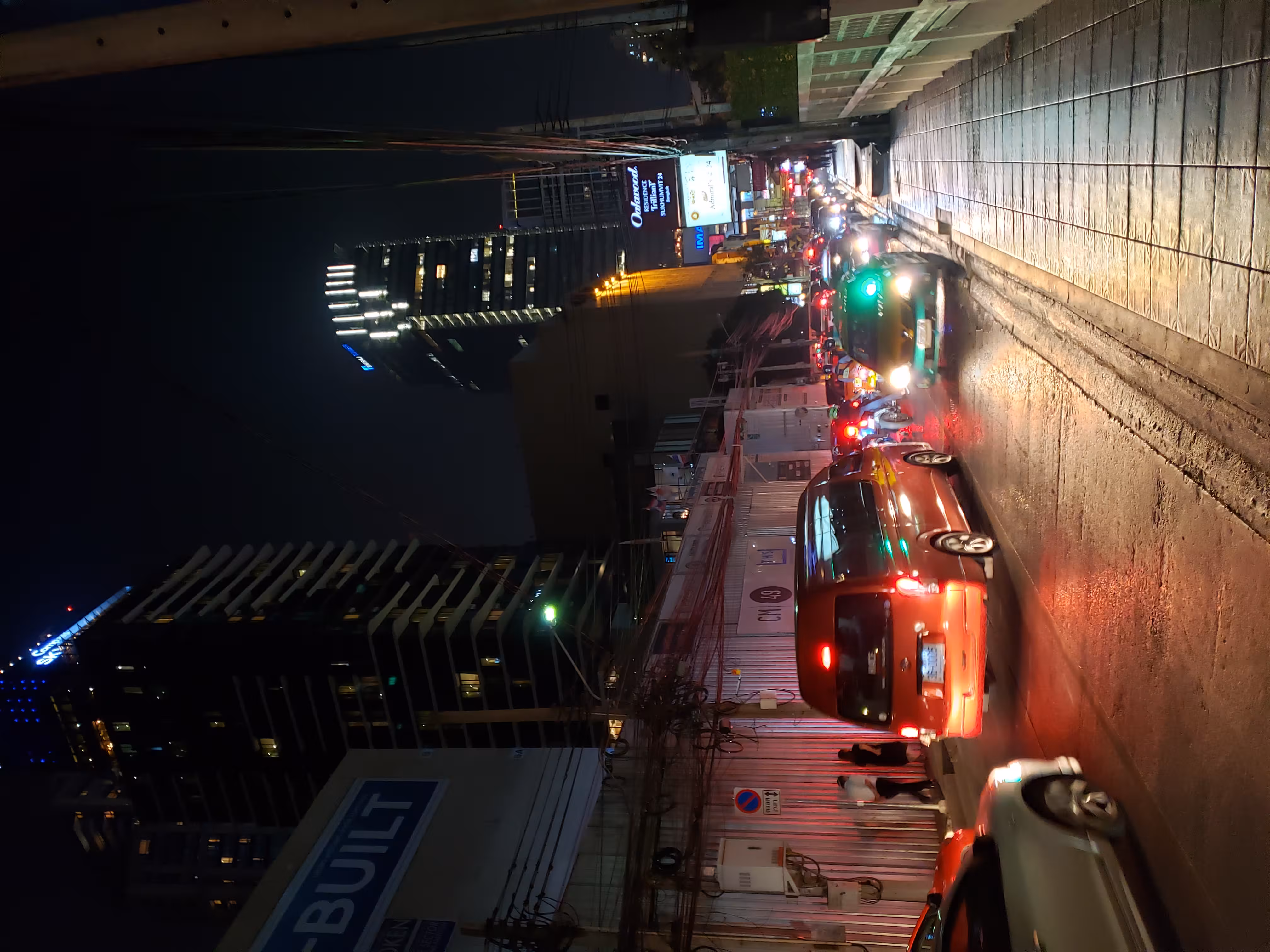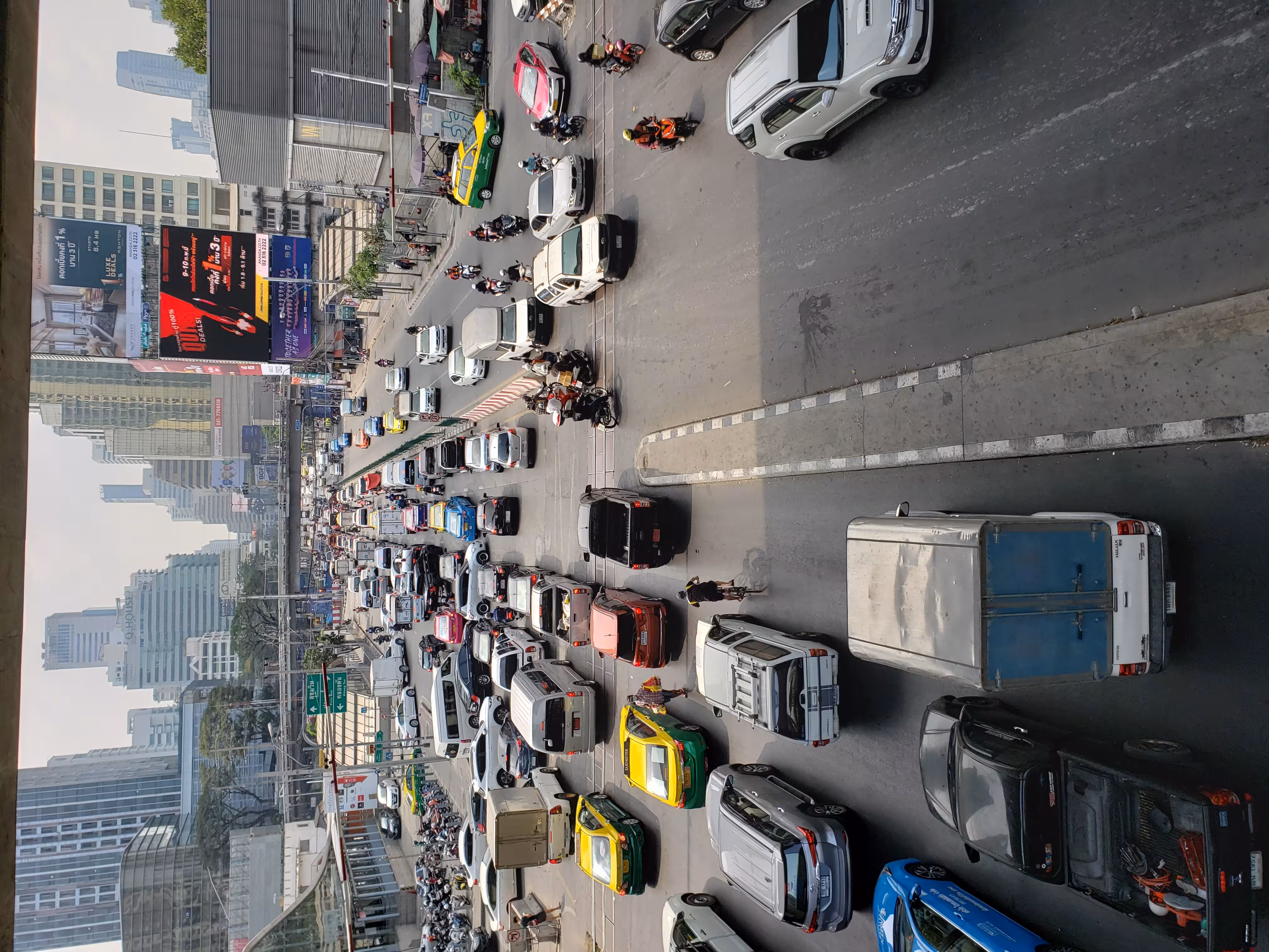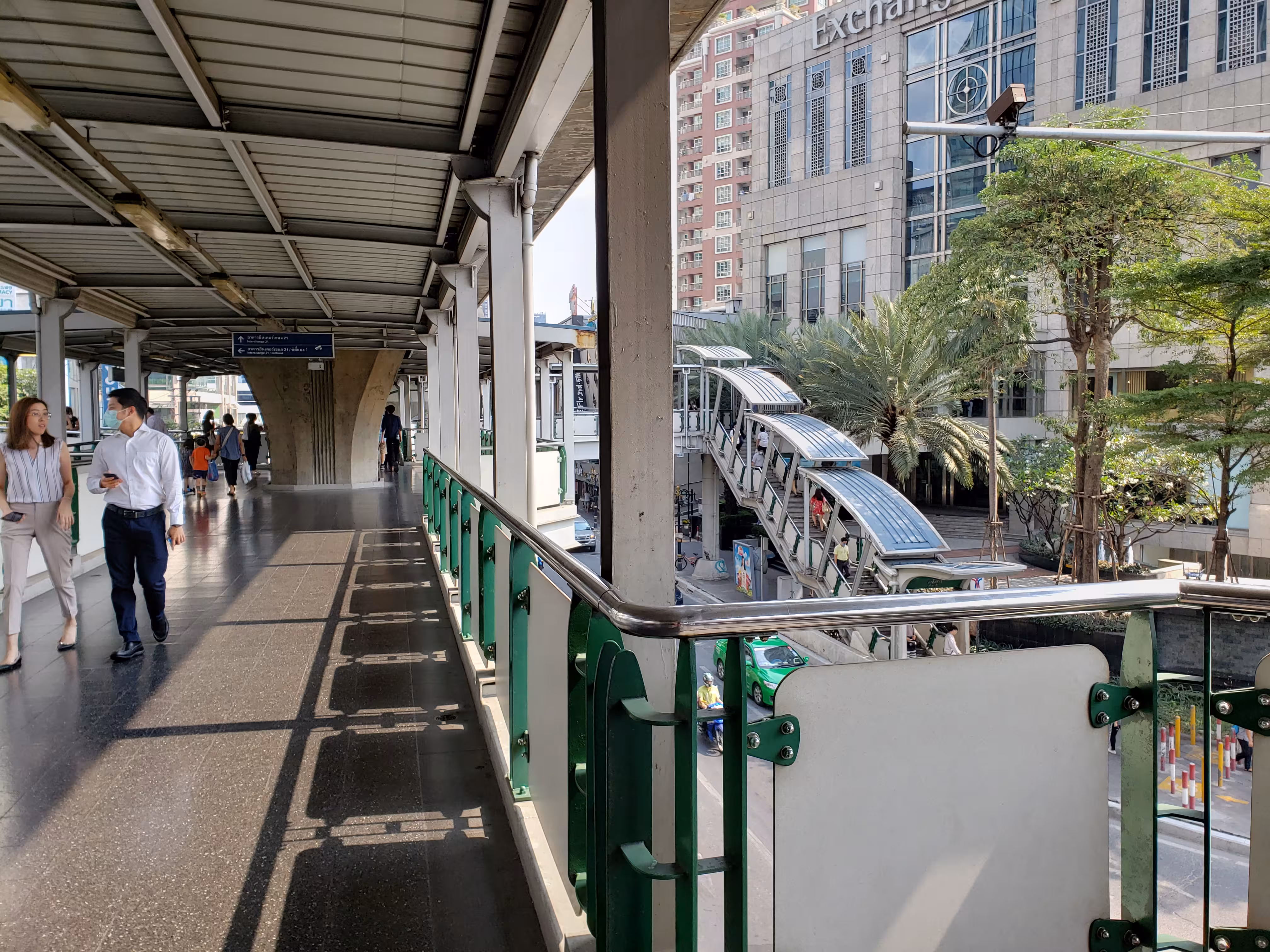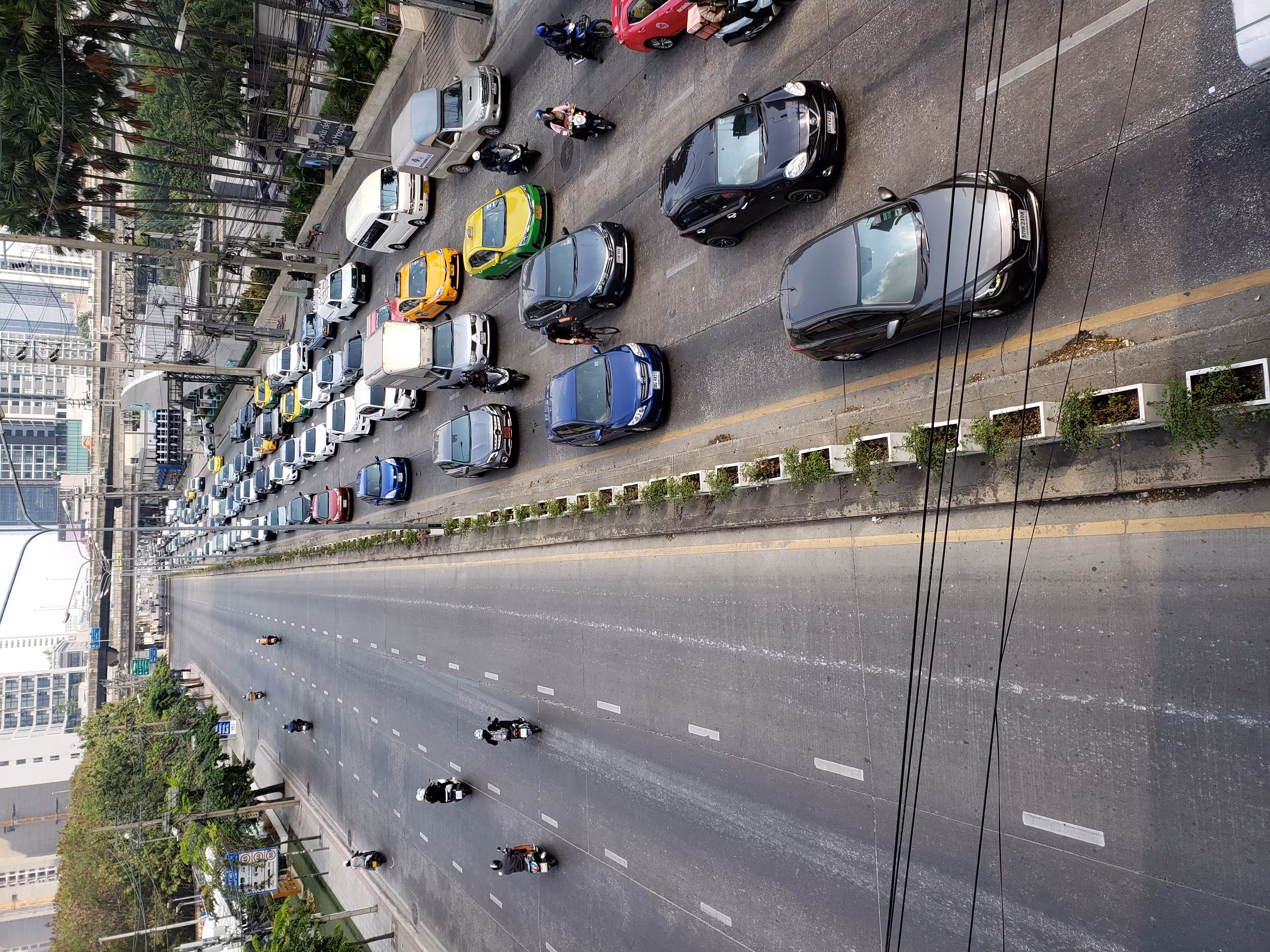 由于下午三点才能入住公寓,我们先转乘地铁到Sukhumvit站,在附近的Terminal 21百货吃点东西。转乘过程中要先出站,走在天桥上就能看到拥堵。不仅机场地铁沿线的这条主干道Phetchaburi Road堵,我们住宿附近的Sukhumvit Road也非常堵。
