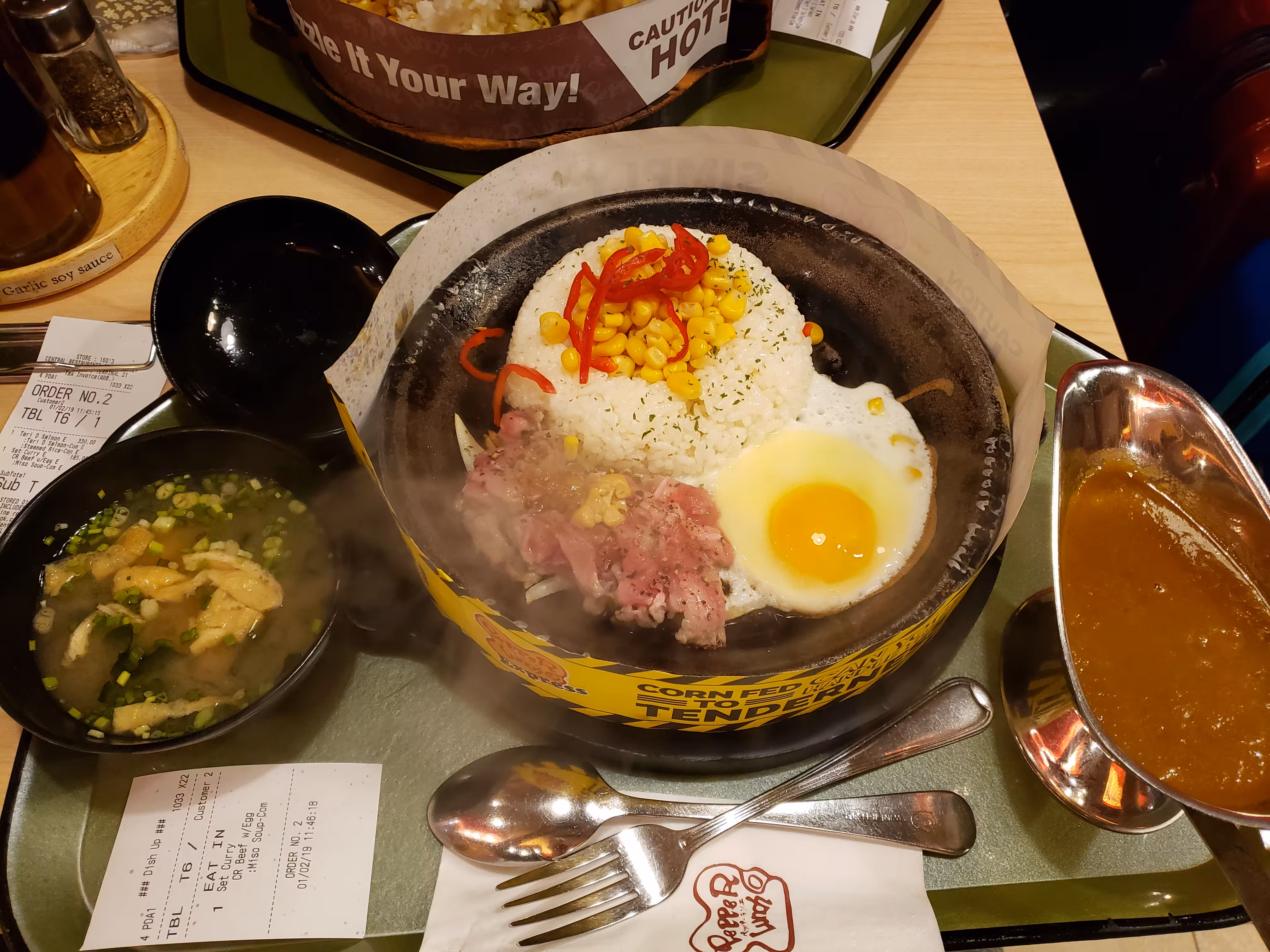 商场大概有十几层,和吃有关的店基本都在高层。我们慢悠悠转上去看了一圈后,我为在曼谷的第一顿饭做了一个保守的决定——Pepper Lunch。之前在武汉吃过Pepper Lunch,是一家主营铁板牛排的快餐店,很对肥仔我的胃口。虽然考虑过到国外就不要重复国内能吃到的味道,不过鉴于在华欣都没有吃过传统的中式偏咸口味,果断选择了它。事实证明… 真香!另外也就是这家店,说他们的支付宝系统坏了…