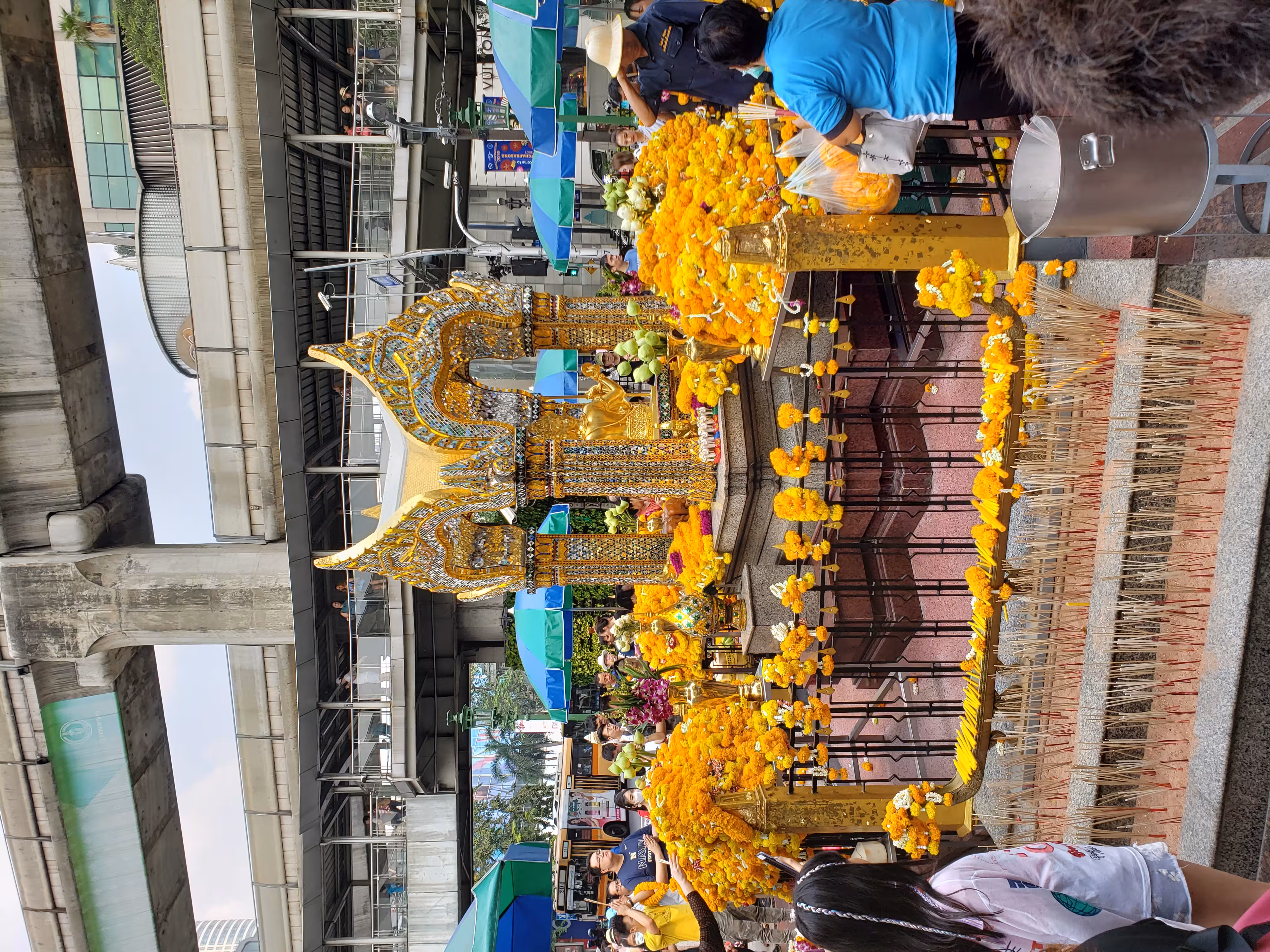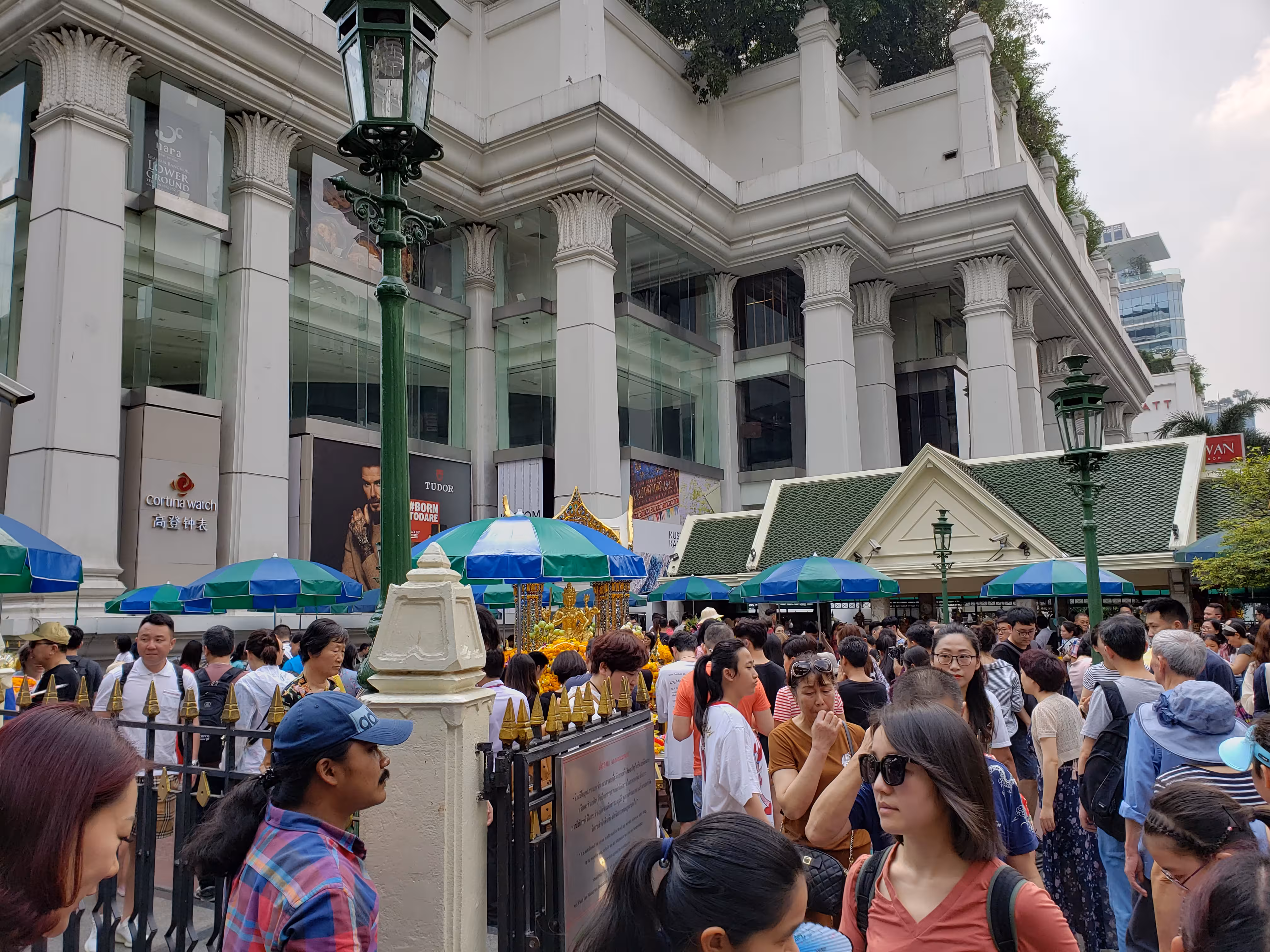 在Grab上打到的第一辆车是丰田Fortuner,运气不错。尽管后面才知道这款车在泰国很常见,不过能坐上一辆汉兰达级别的出租车,还是很不错。不一会到了四面佛,下车后能明显感觉到旅游景点的人多,那场面,那是相当壮观,真是锣鼓喧天、鞭炮齐鸣、红旗招展、人山人海… 但四面佛景点特别小,就是一尊佛龛,紧靠着购物商场。
