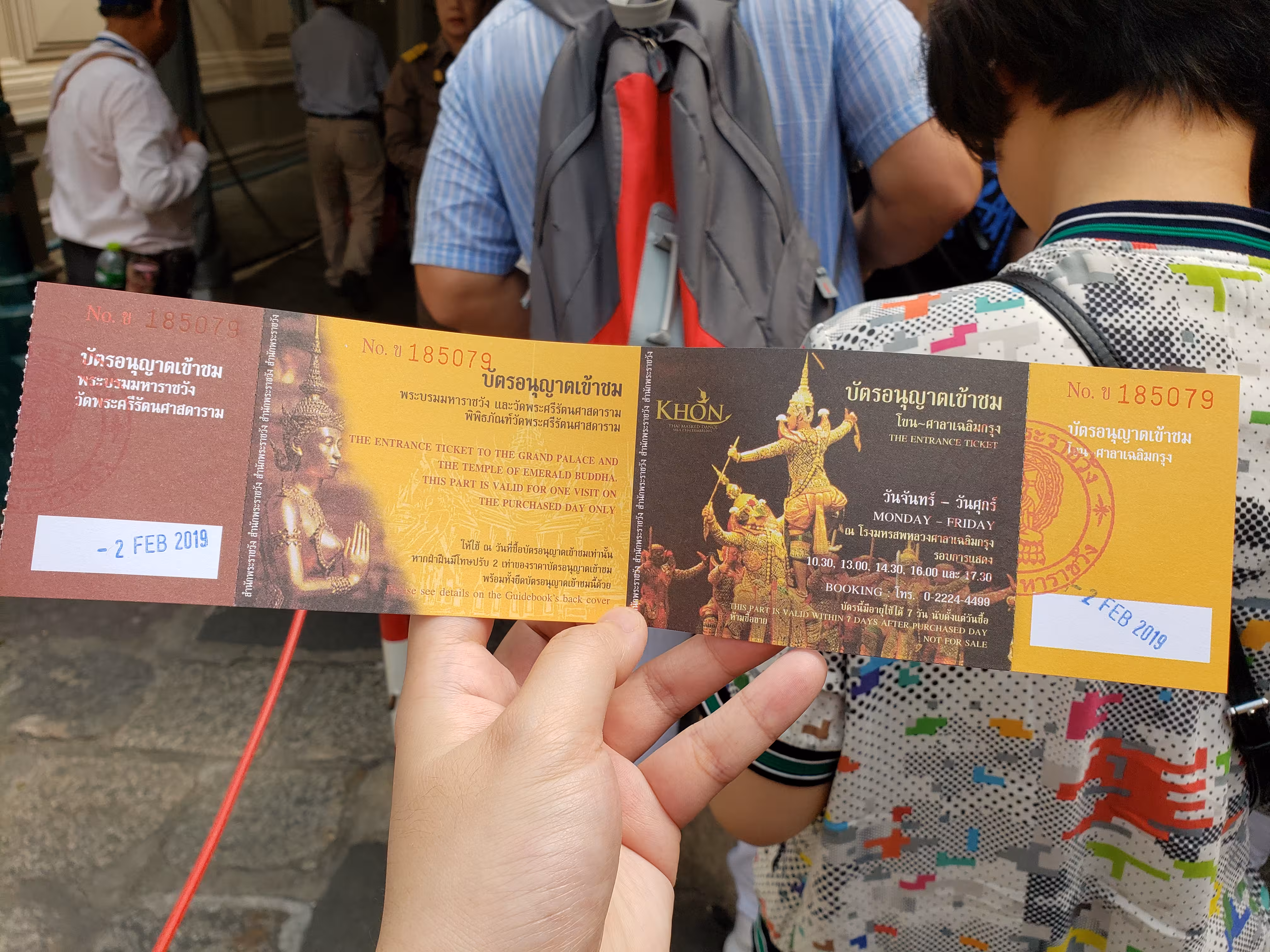 经安保人员的指示,走完为疏导客流设置的一个大圈,进入了大皇宫的第一道围墙。一进大门就可以听到警察和工作人员大妈在大声叫喊,拦住着装露出膝盖的游客去旁边的商店买条裤子穿上(还好穿拖鞋他们不管),很不幸我的短裤也不及膝盖… 裤子很薄,印着类似青花瓷图案,200泰铢不贵,只是排队又多花了时间。下图中间的男高个老外手里拿的应该就是刚买的裤子,有兴趣自己网上找图看吧~
