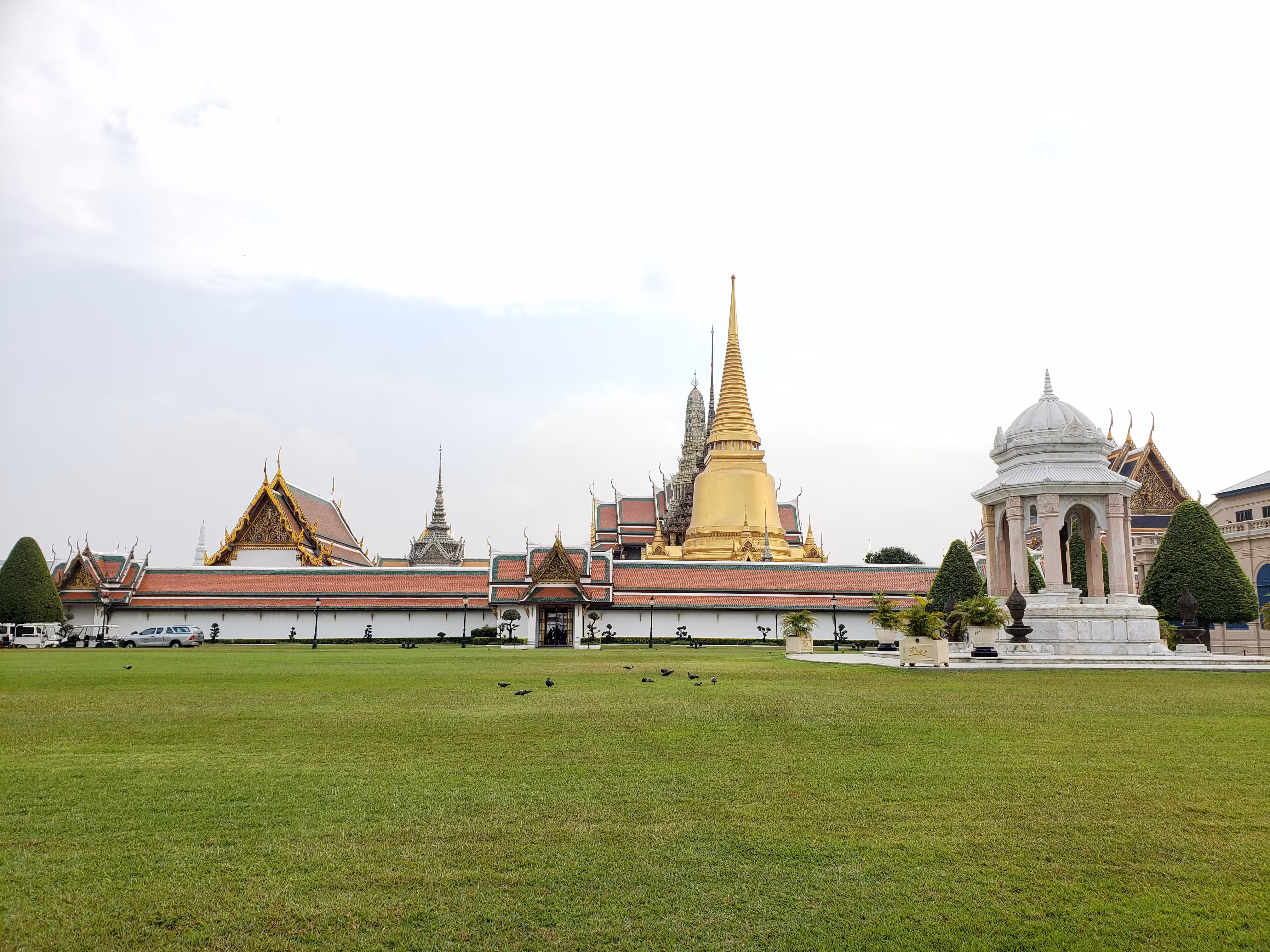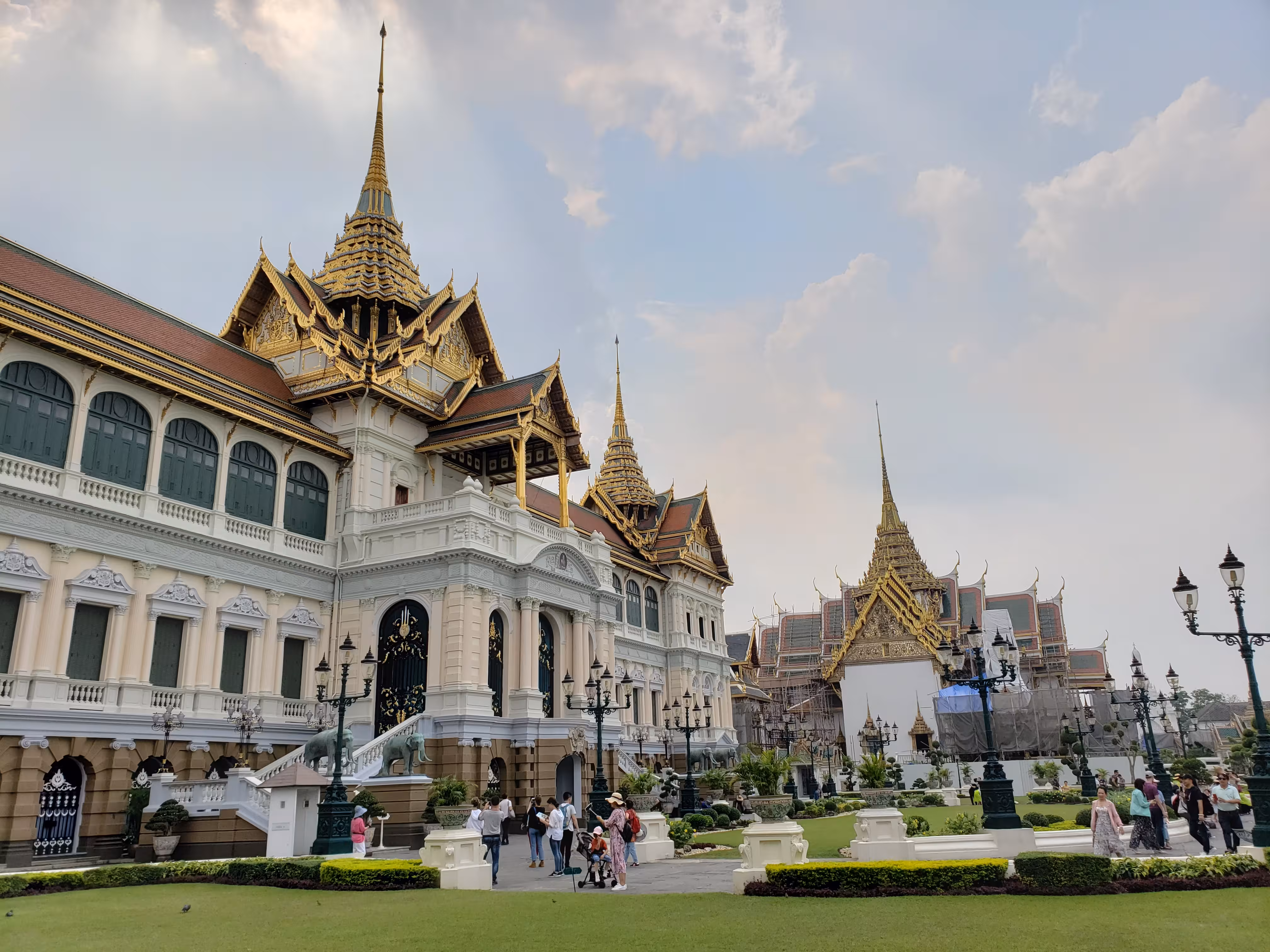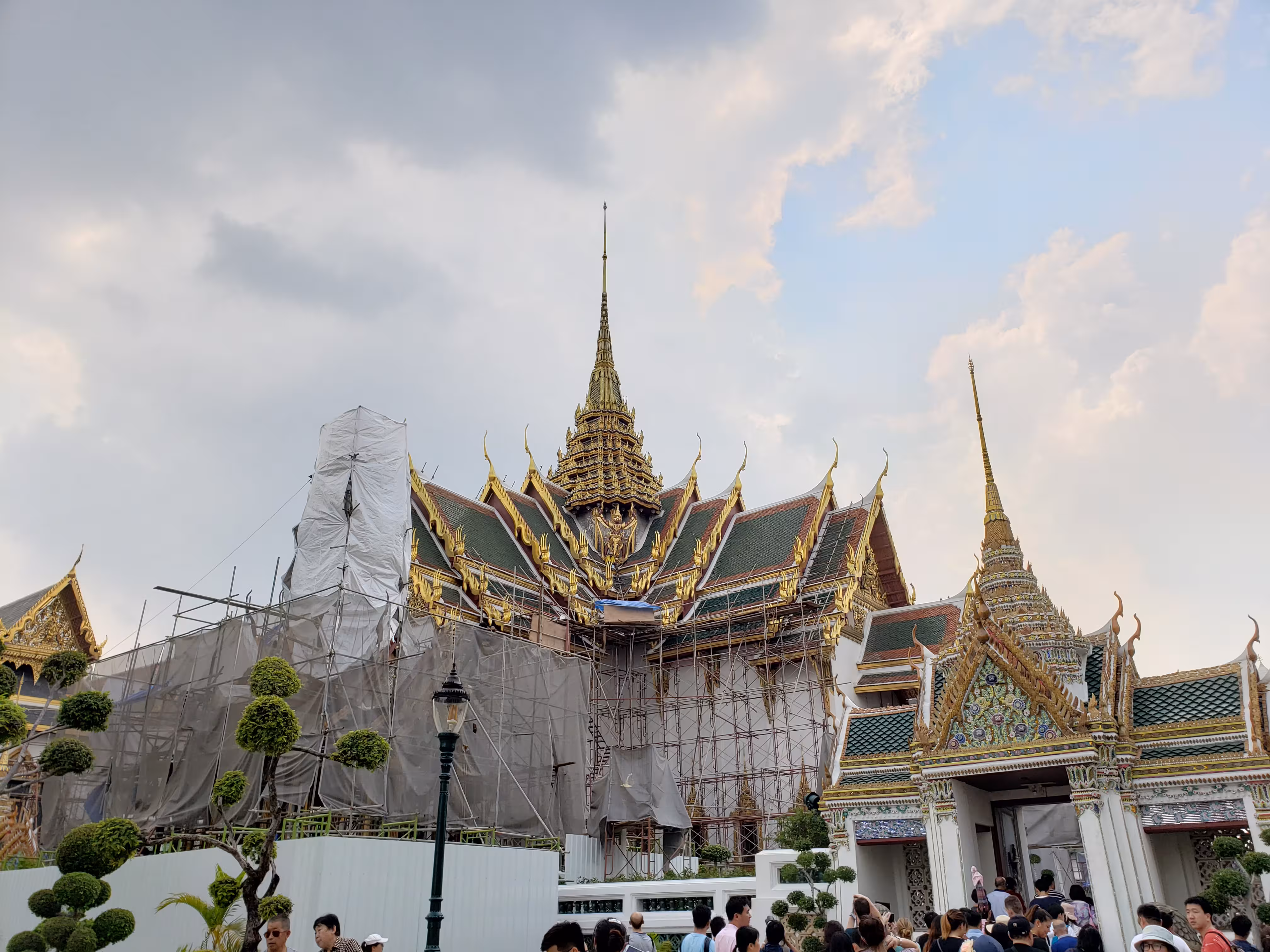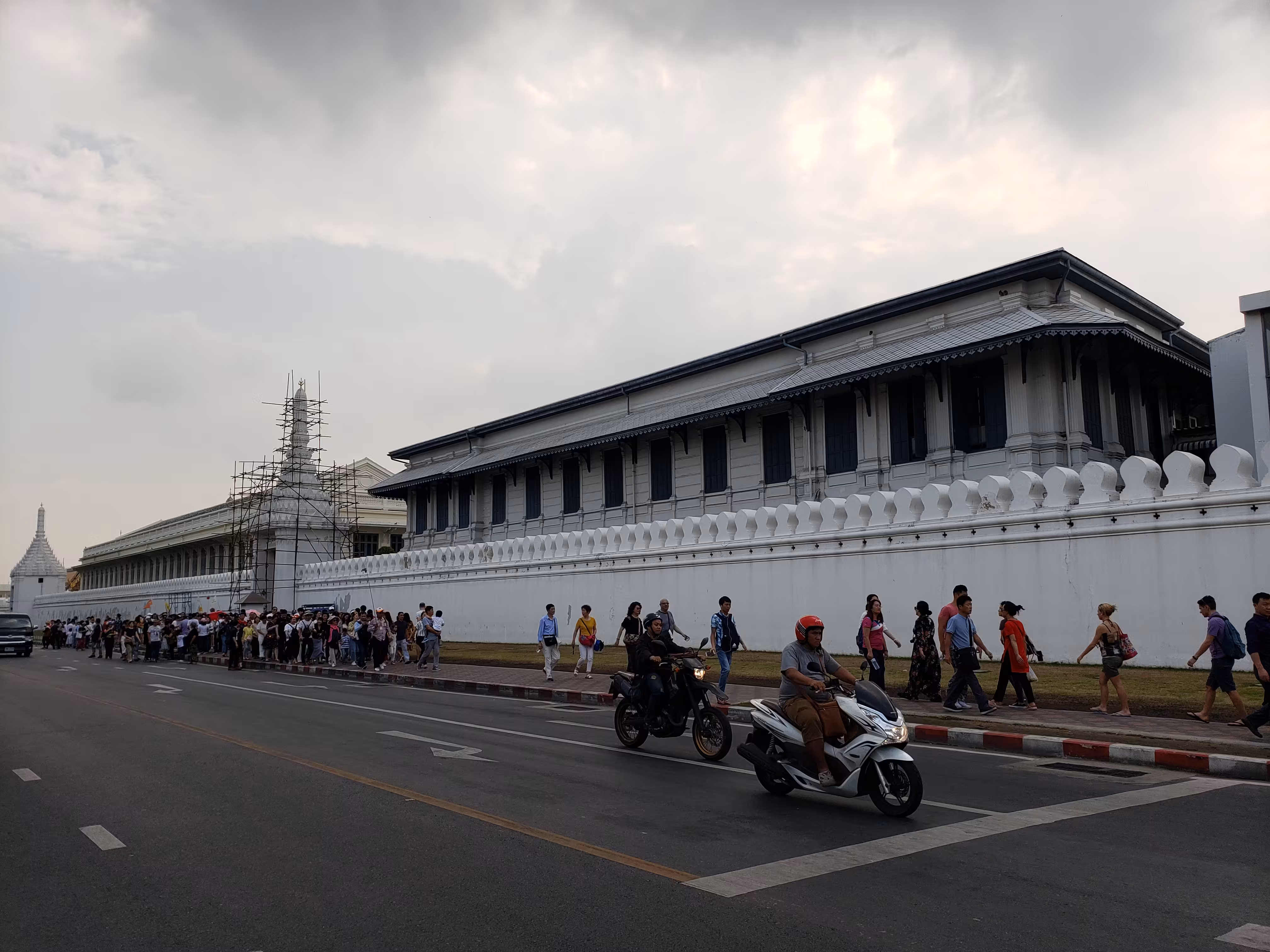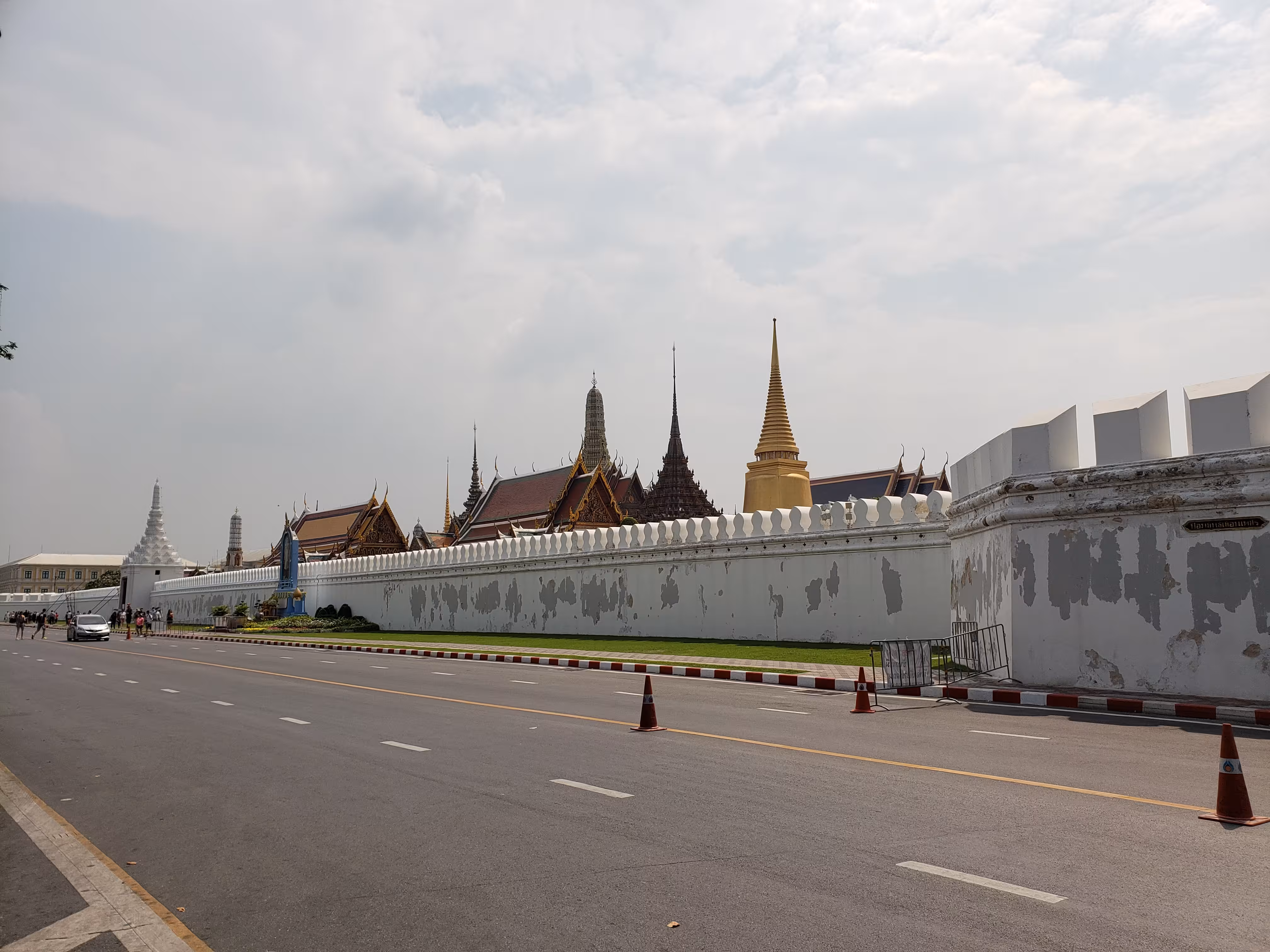 虽说是说好价后司机应该不会绕路,我还是下意识打开Google Maps时不时看看路线。一路上比较通畅,大概半小时抵达大皇宫附近,明显感受到了汹涌的人潮。我们一开始没找到入口在哪,先沿着宫殿围墙走了几分钟。