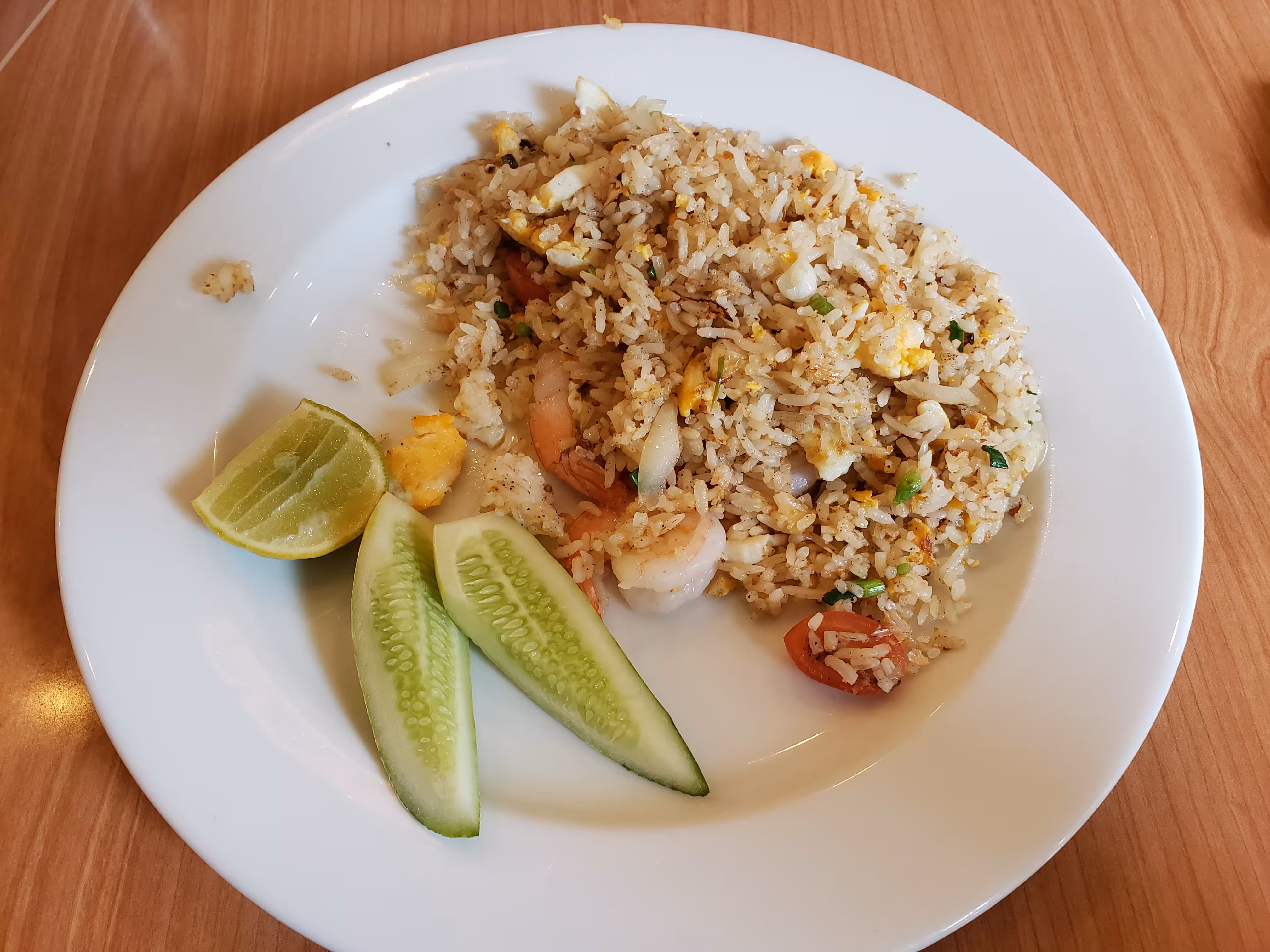 从大皇宫出来已经两点出头,急需补充能量,我们就近选择了马路对面的一家海军餐厅解决午饭。不得不夸赞泰国的旅游业很规范,无论是大皇宫内卖的矿泉水(10฿,大约两块钱人民币)、饮料,还是地理位置这么好的餐厅,没有因为是热门旅游景点就坐地起价。
