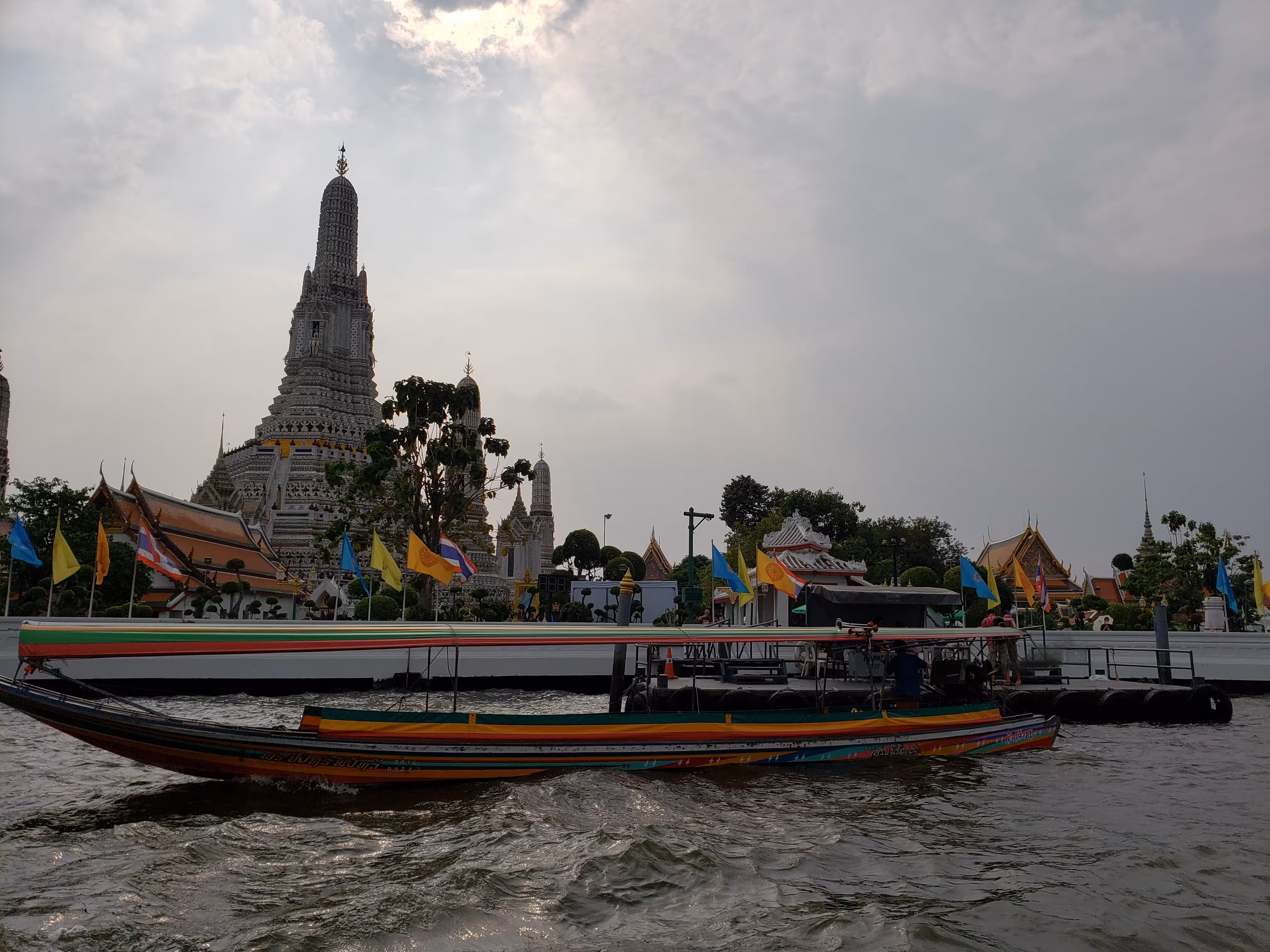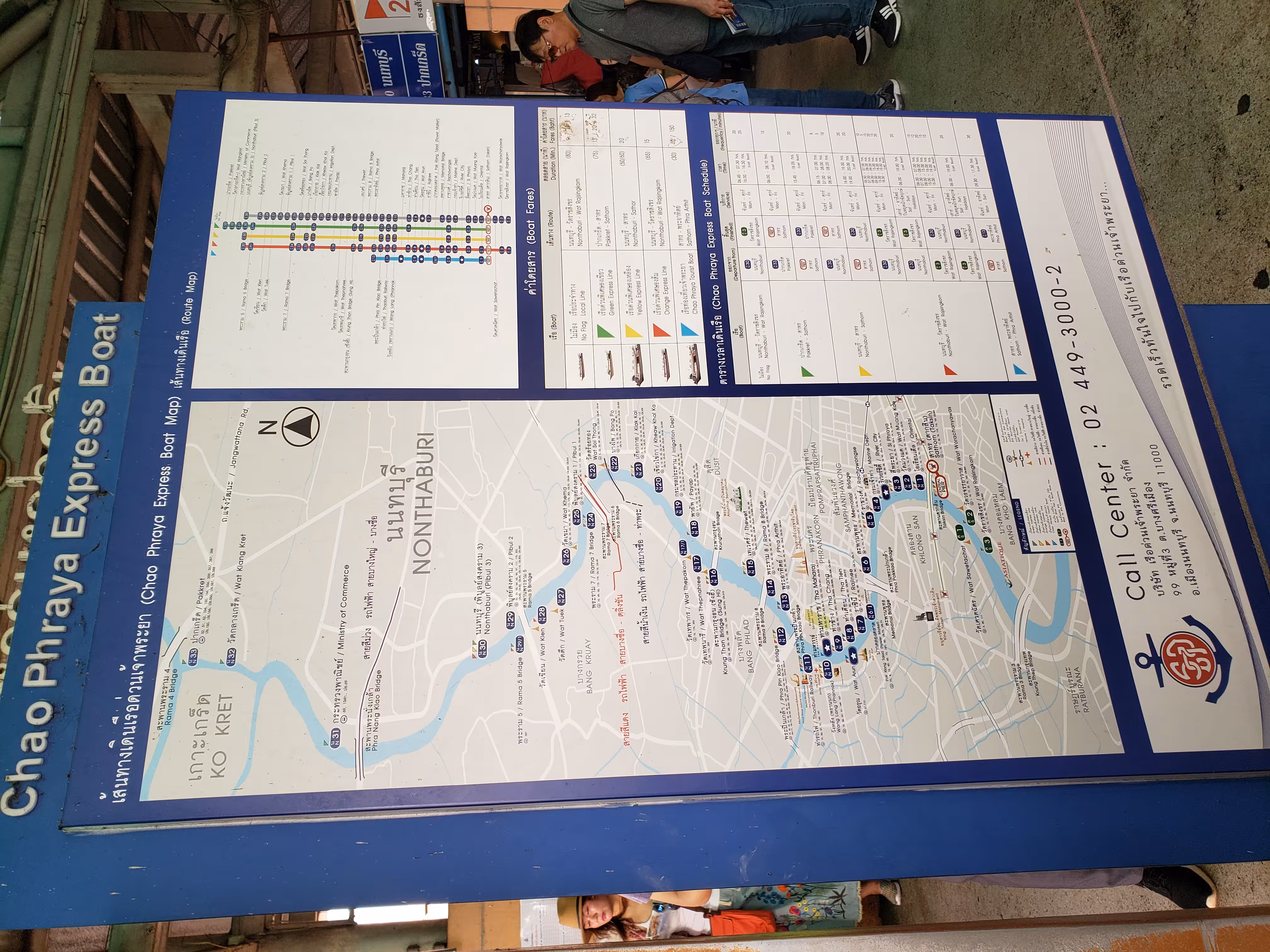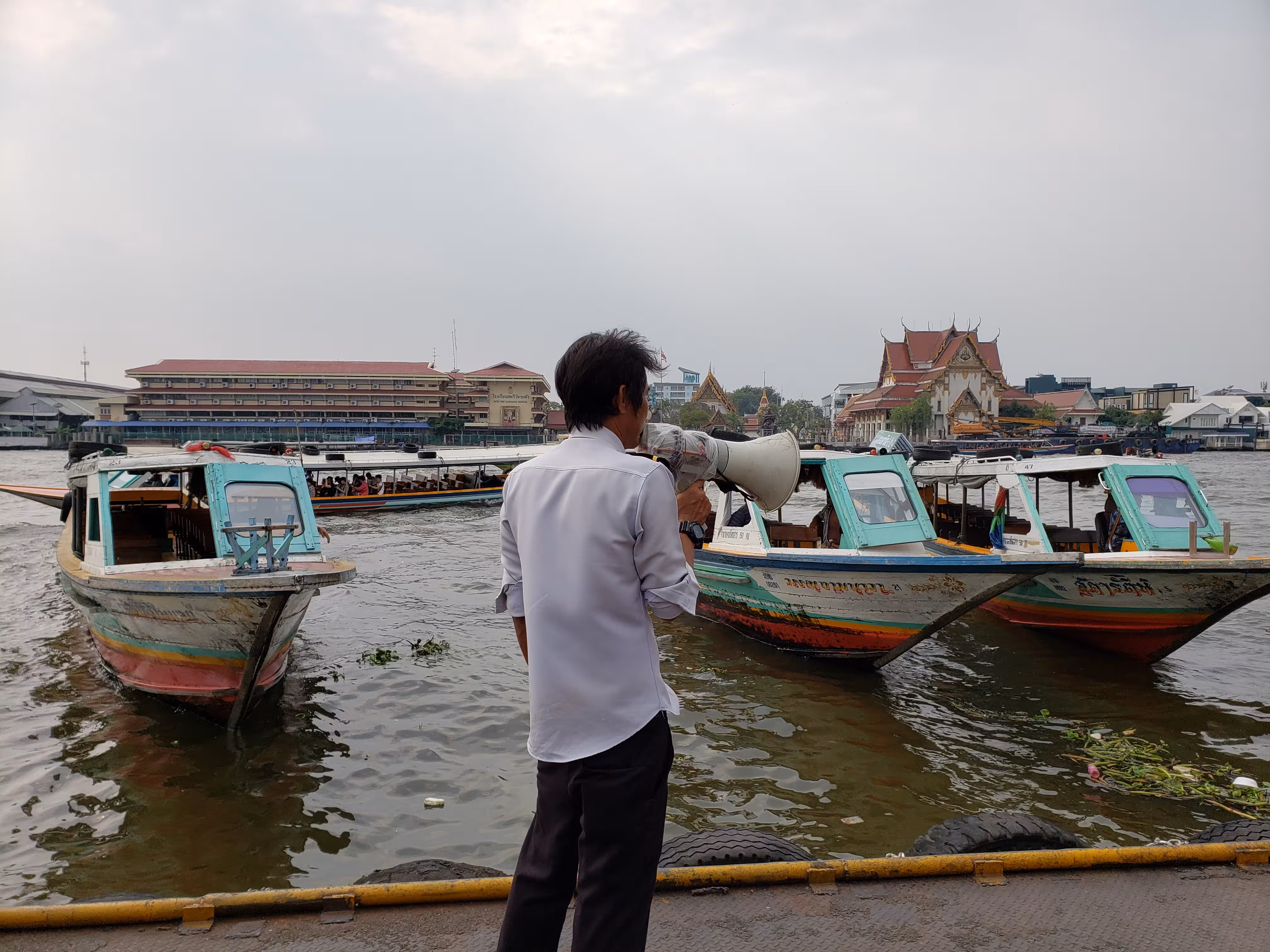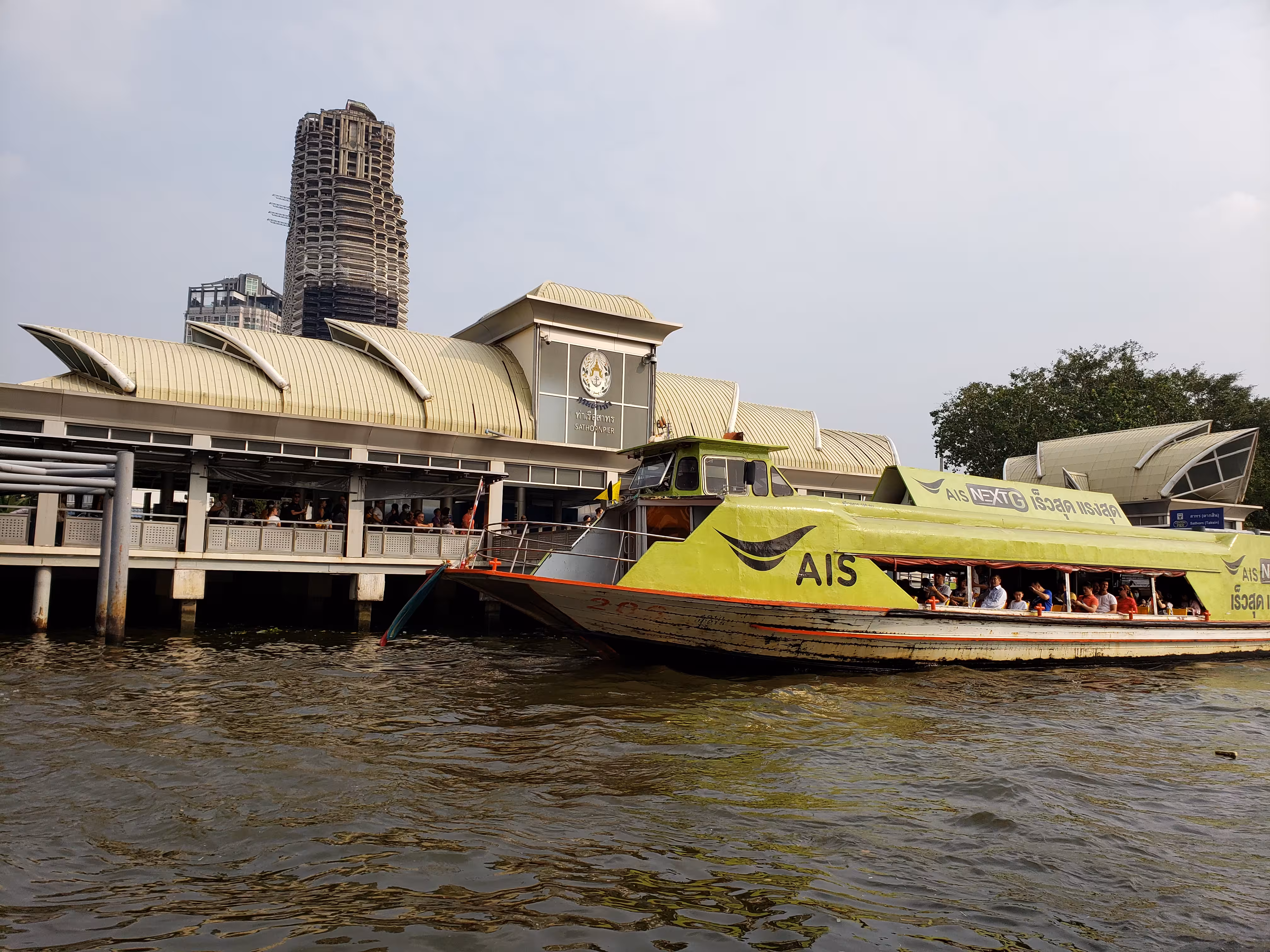 吃完歇到三点,我们来隔壁的码头坐船,欣赏一下湄南河的风景。对着地图确认好我们要乘坐的线路和对应的游船类型,买票后排队等待船来。船票价格和武汉的轮渡差不多,码头岸边的柴油味有点重。