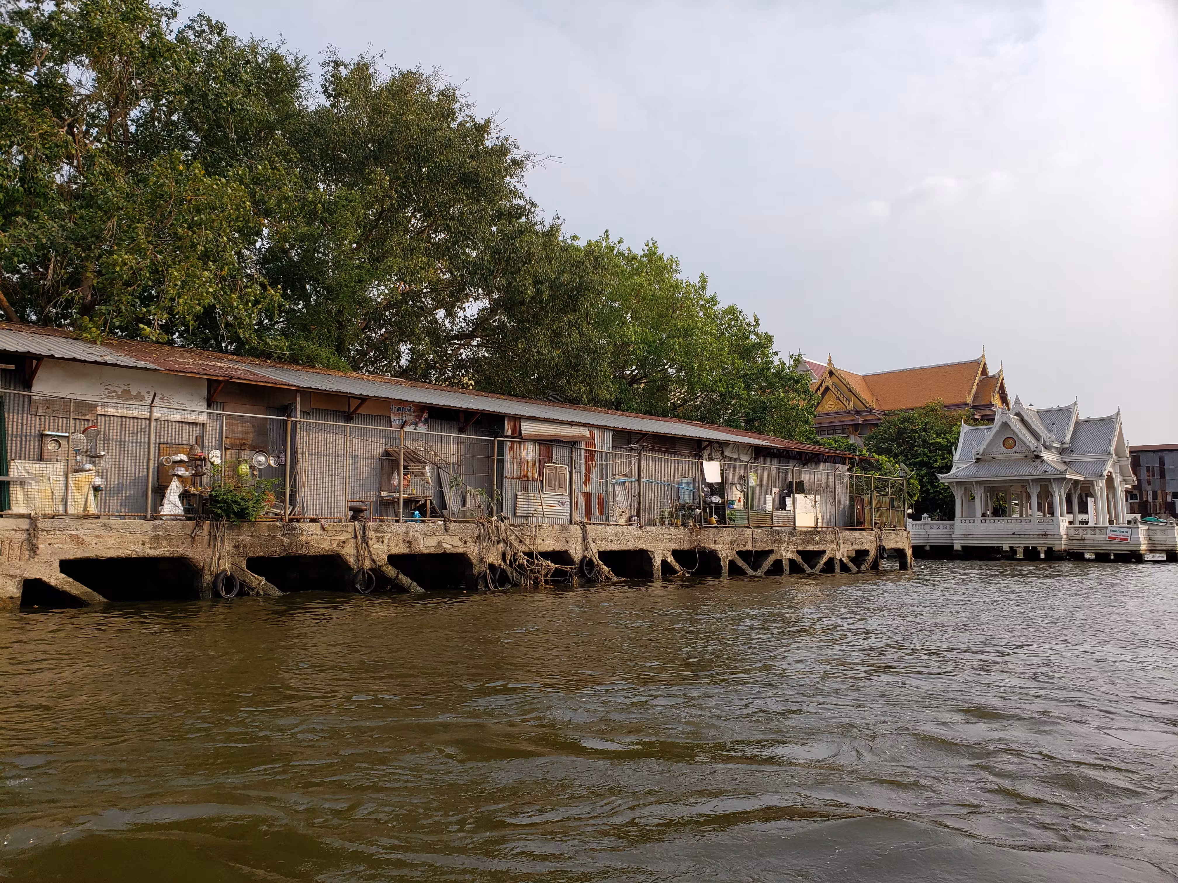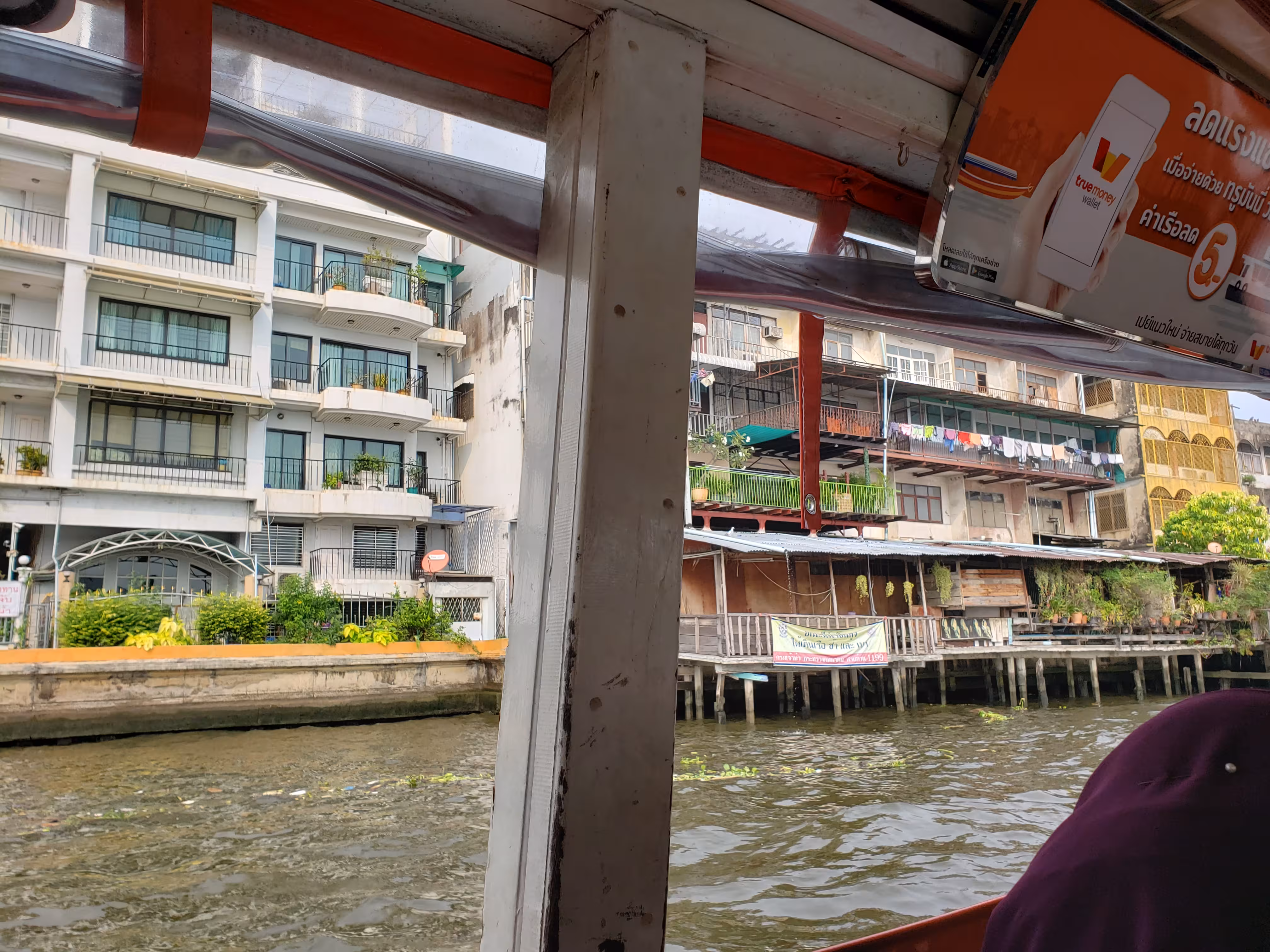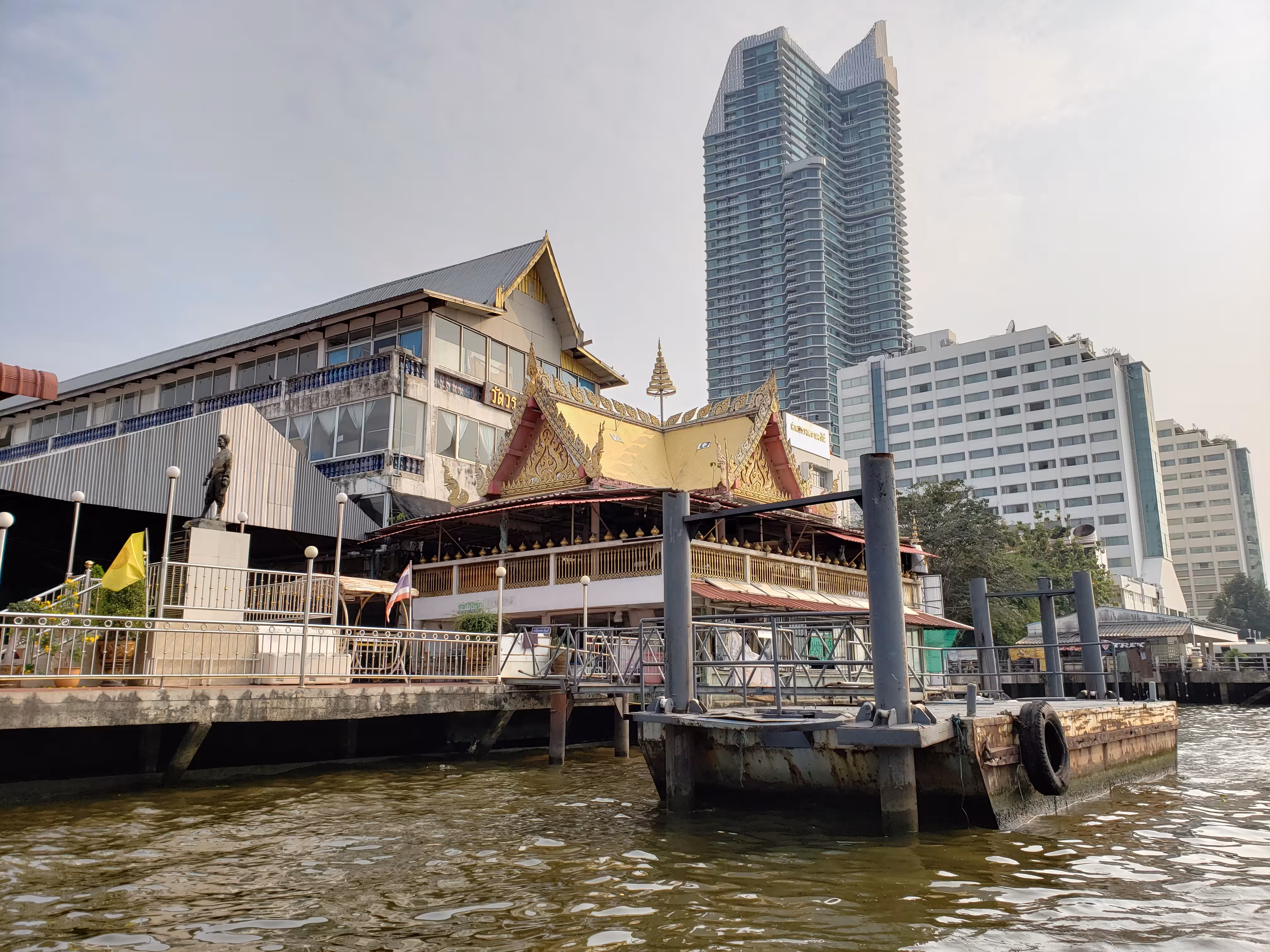 湄南河其实没啥好看的,河水比较浑浊,两岸的建筑风景不错。轮渡乘客非常多,包括我们这样的游客和本地人。河岸两旁既有一些高大上的餐厅、景观,也有破破烂烂、饱含生活气息的小破屋,反映了这个城市巨大的贫富悬殊。