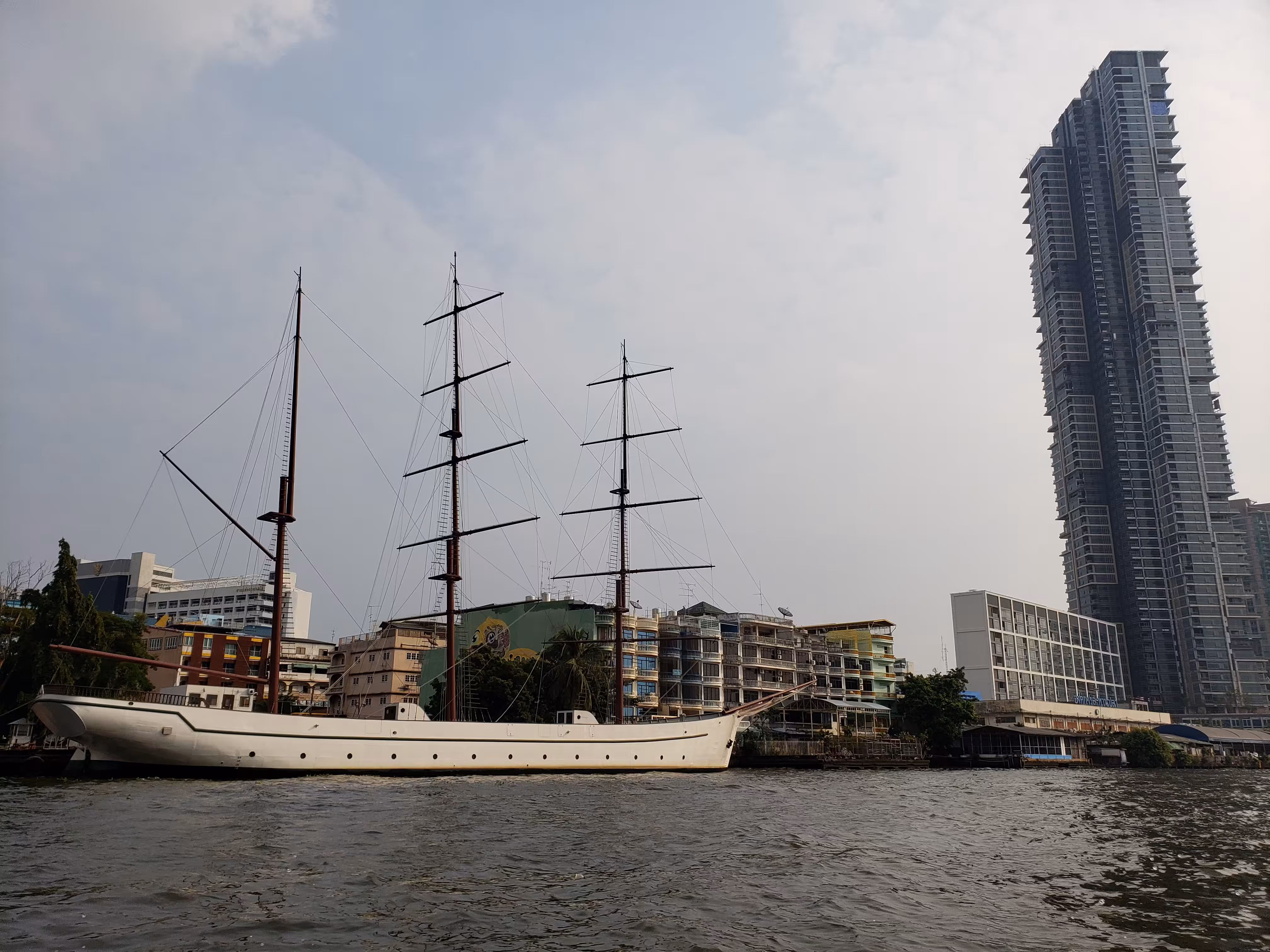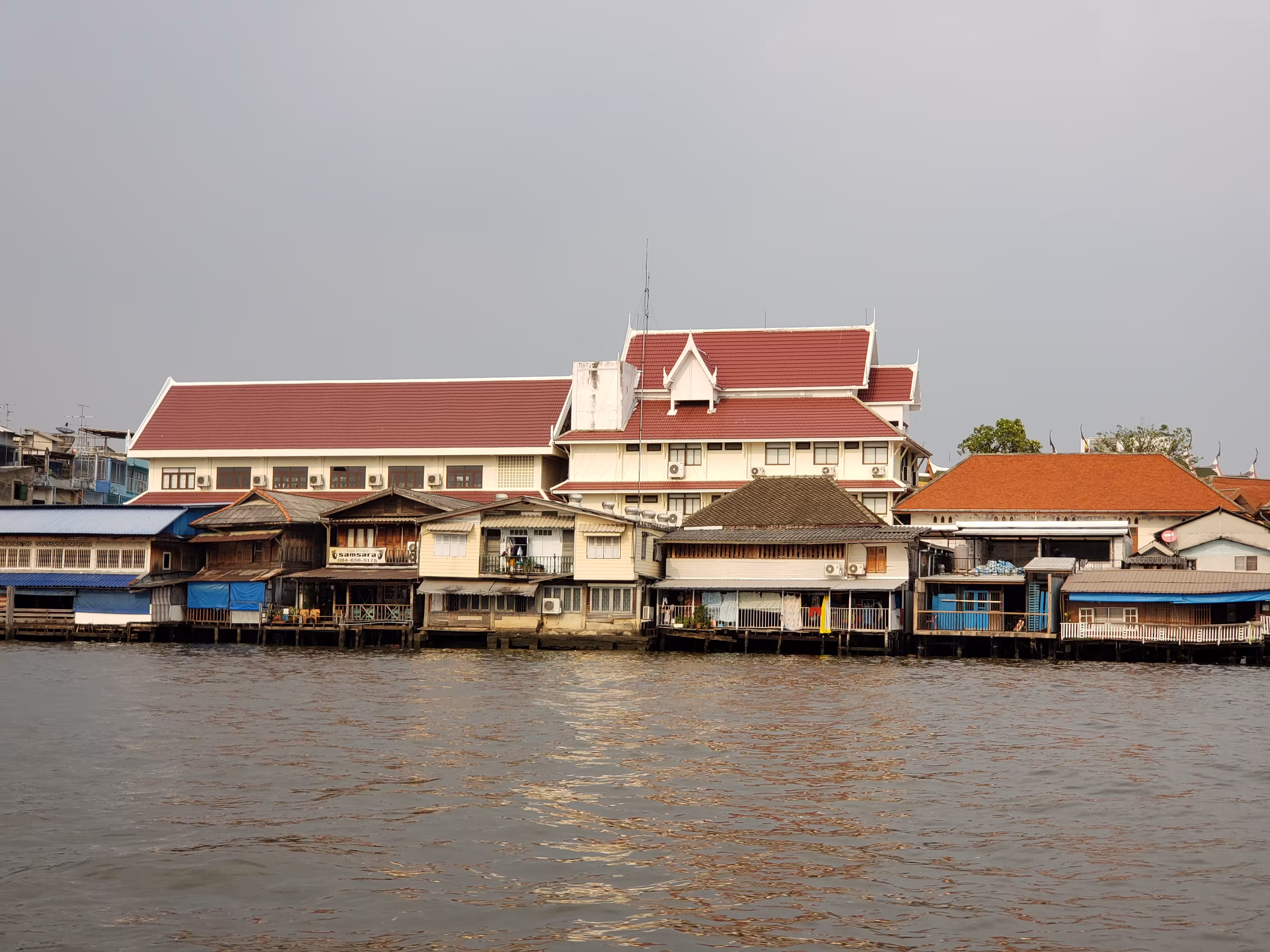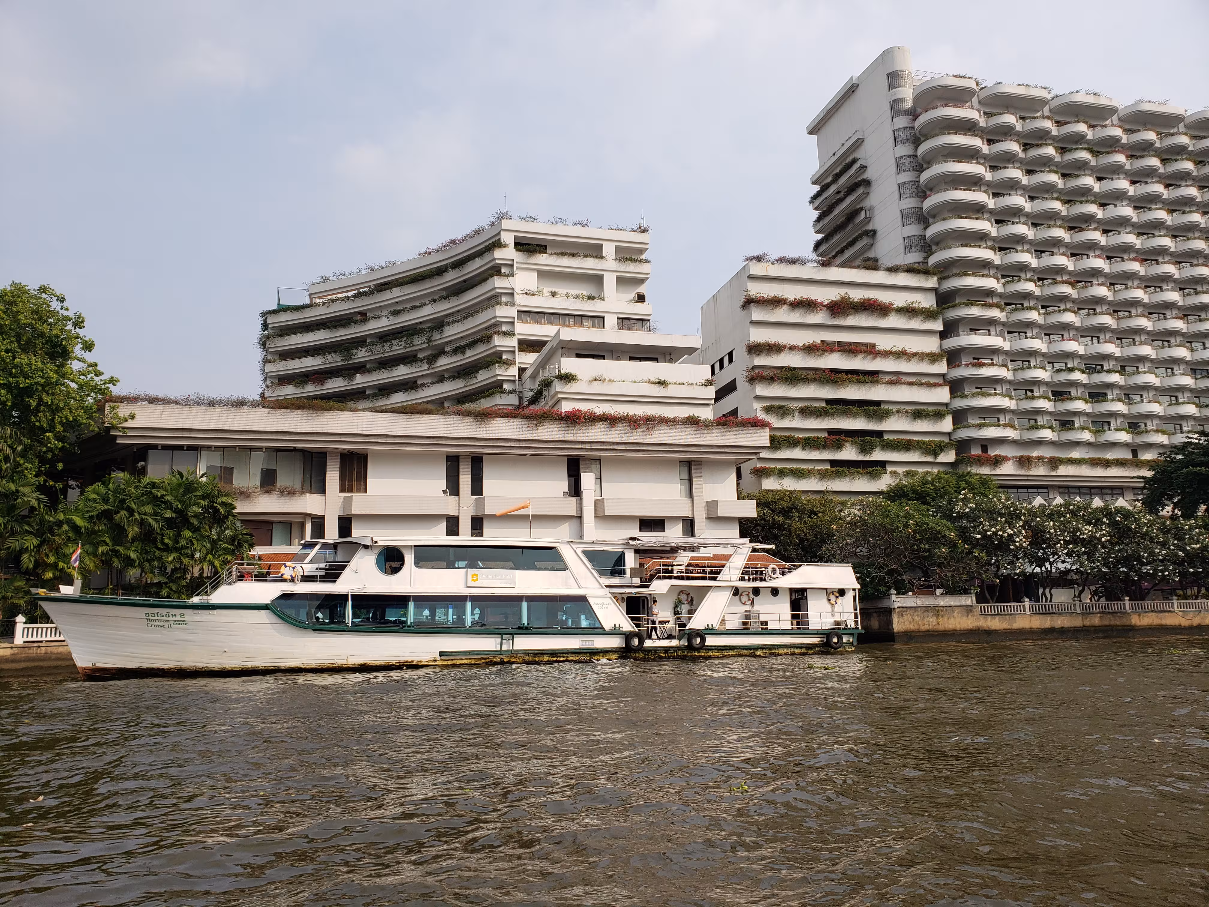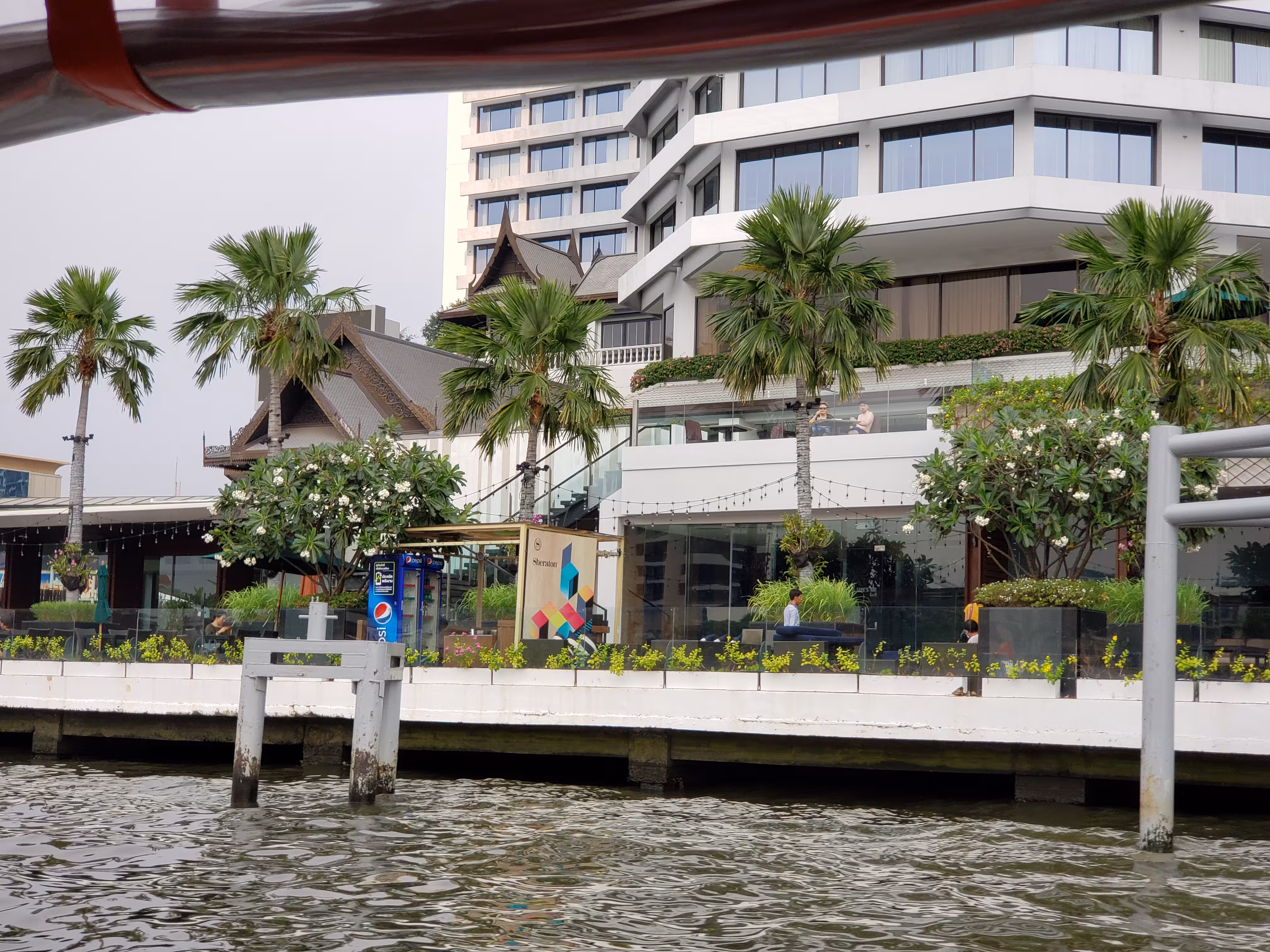 湄南河其实没啥好看的,河水比较浑浊,两岸的建筑风景不错。轮渡乘客非常多,包括我们这样的游客和本地人。河岸两旁既有一些高大上的餐厅、景观,也有破破烂烂、饱含生活气息的小破屋,反映了这个城市巨大的贫富悬殊。