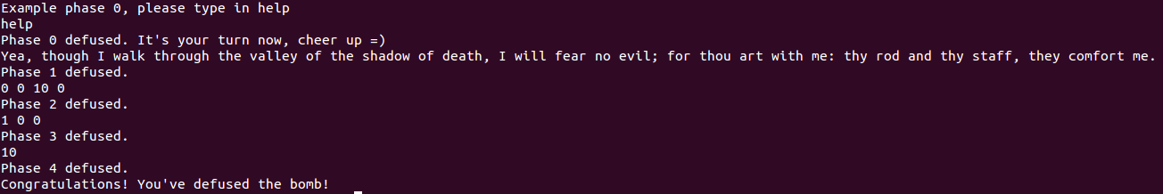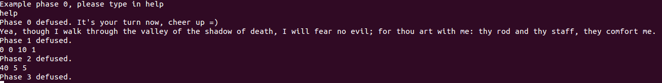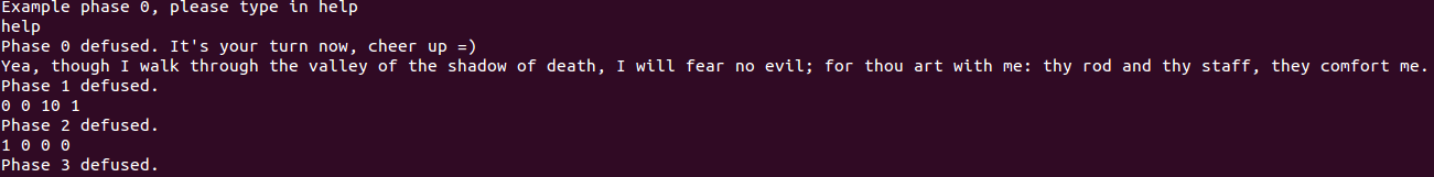 b phase_0設好斷點後,一個c來到phase_0函數,在源程式端輸入help,則可見:![]()