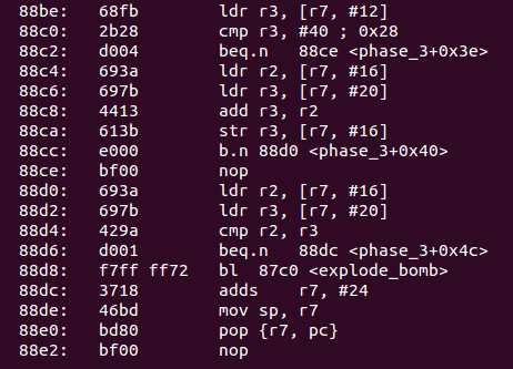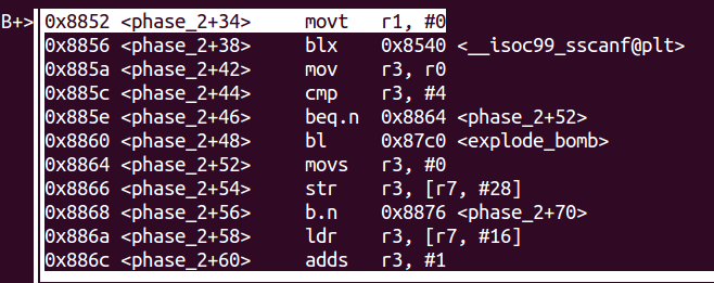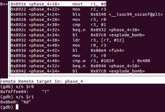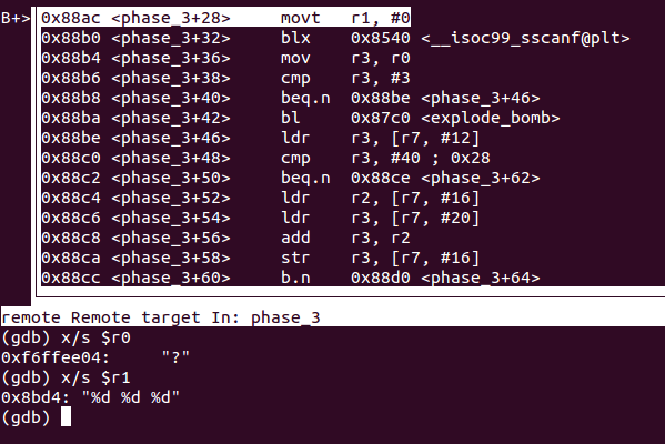 phase_3後隨意輸入進入斷點,印出r1的值,爲"%d %d %d",後面也有判斷輸入個數的代碼,和階段2同理:![]()