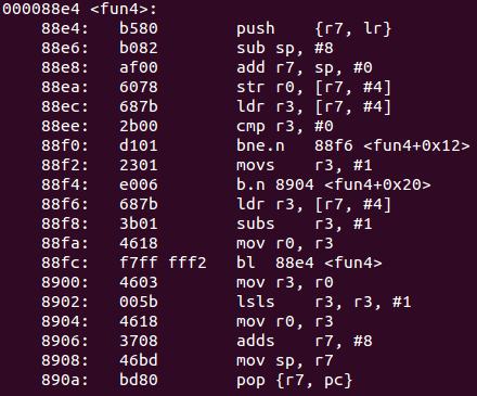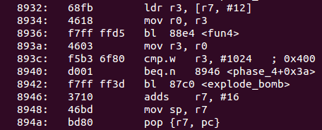r3不爲0時,會一直減1然後調用自身函數;當r3終於減到0後,會在0x88f2賦值爲1,然後跳到8904,回傳上一層的fun函數。然後r3=r0=1,開始左移 - 所以相當於輸入的數字n,可以滿足2的n次方爲1024,即是正確答案,真相如下: