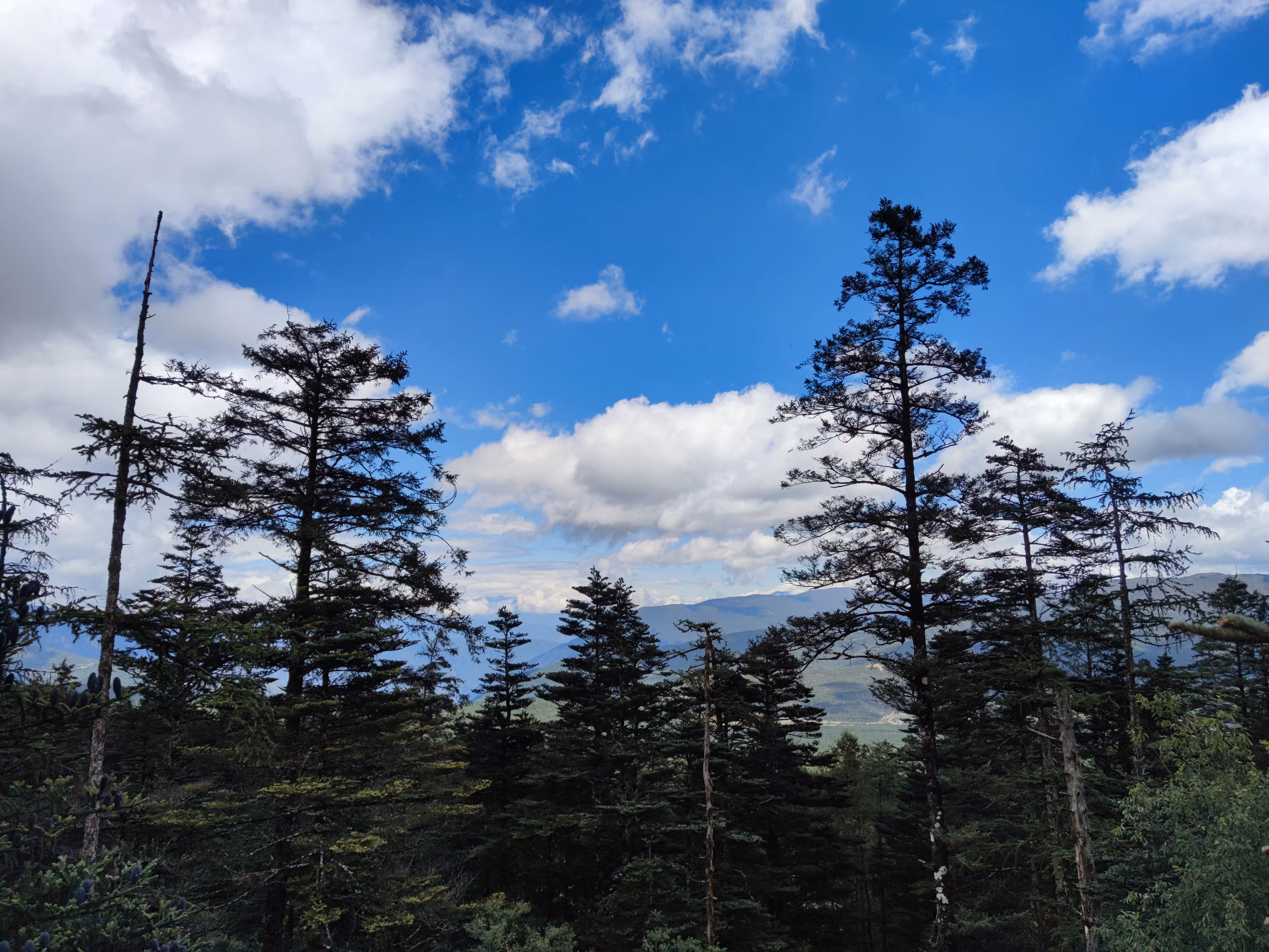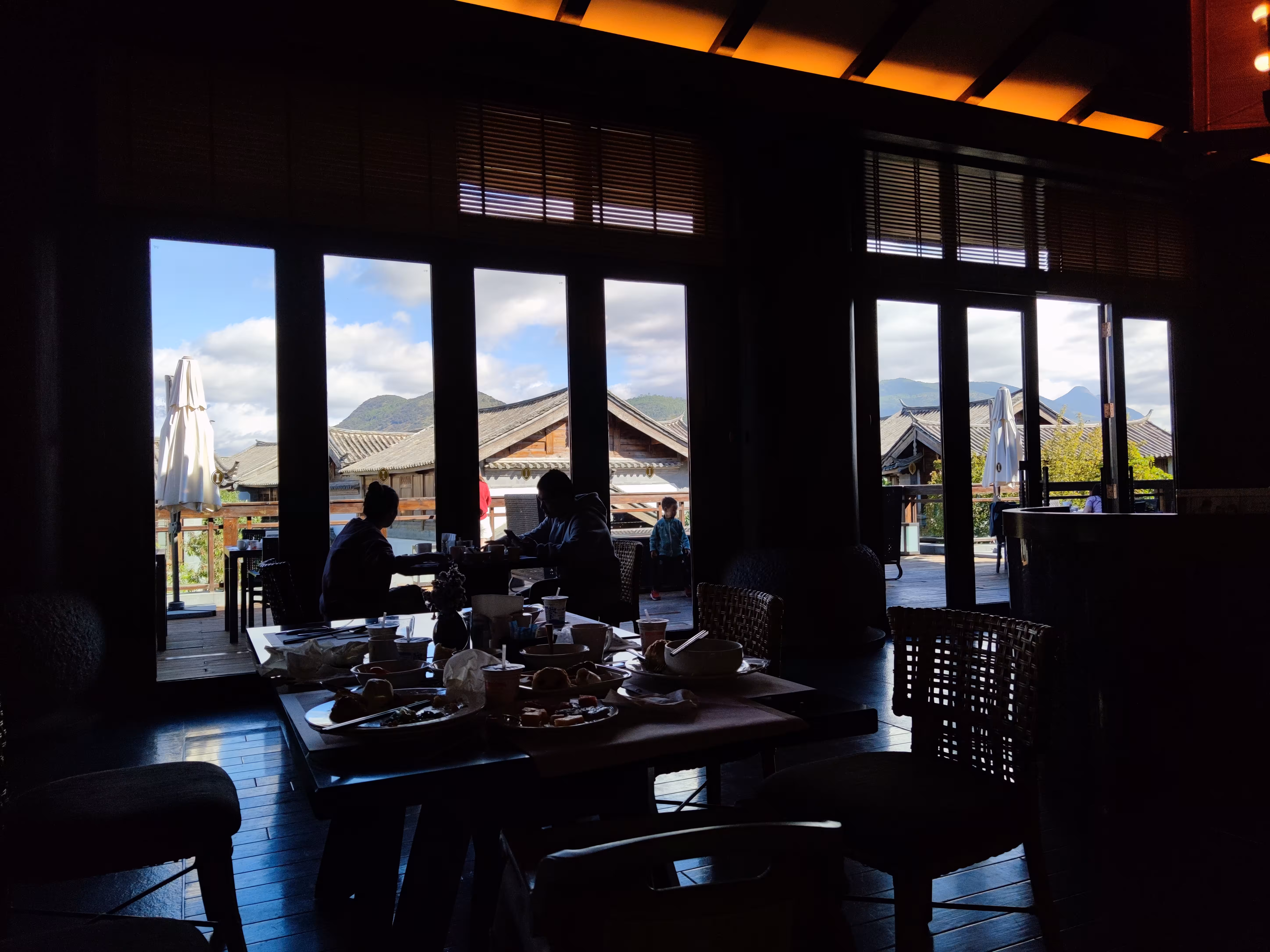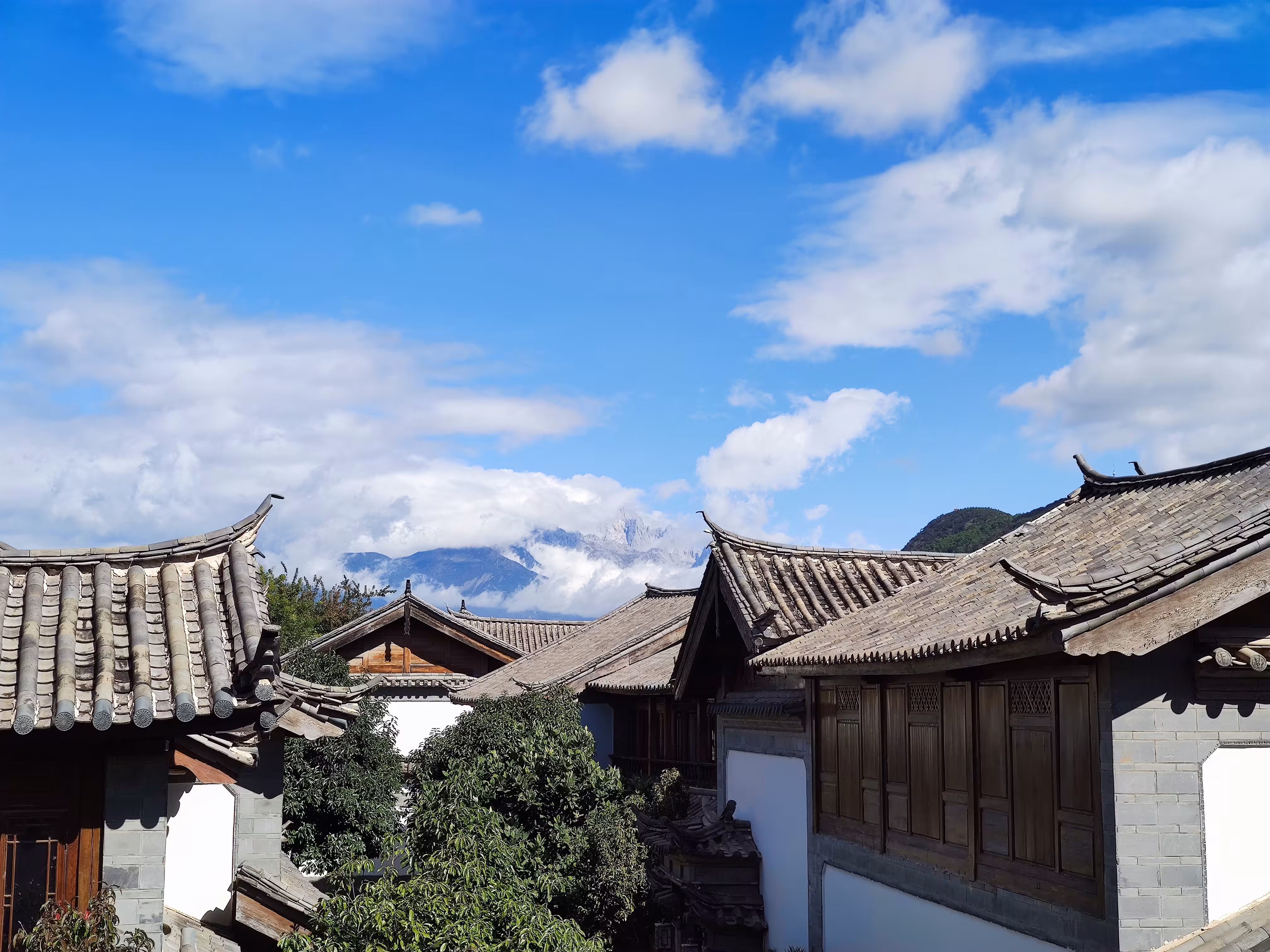 吃饱站在外面的天台,找个合适的角度能看到雪山。