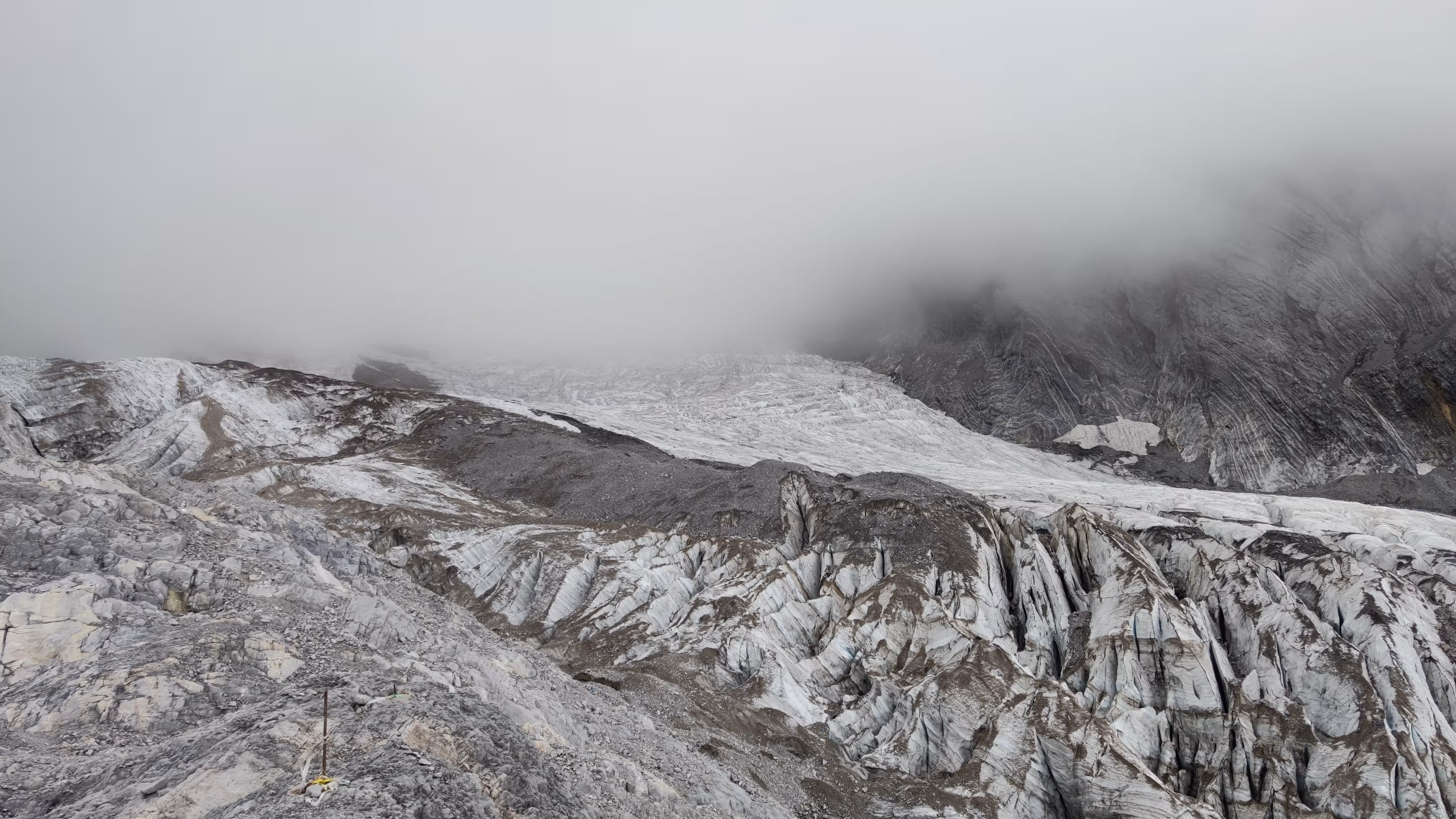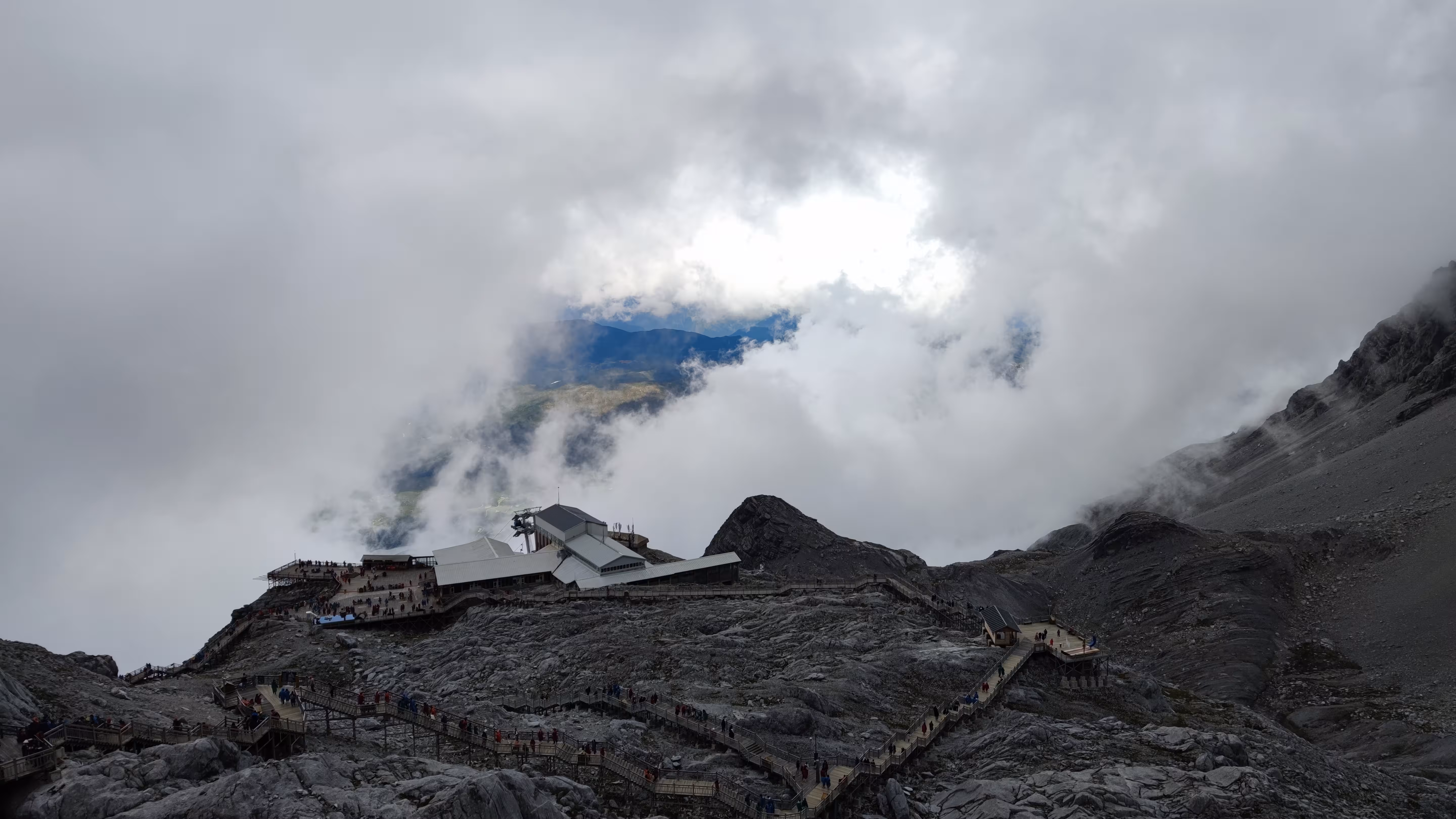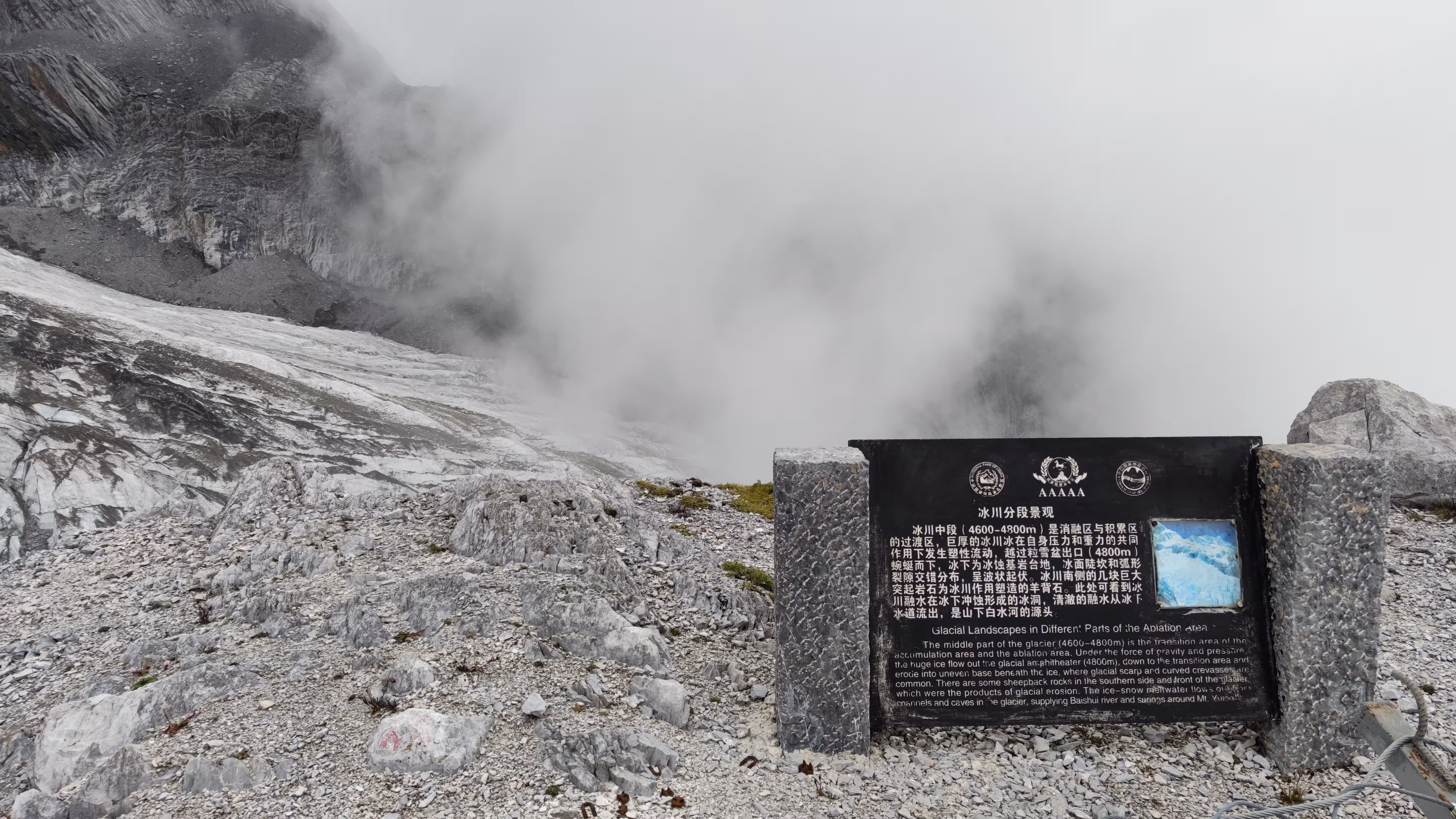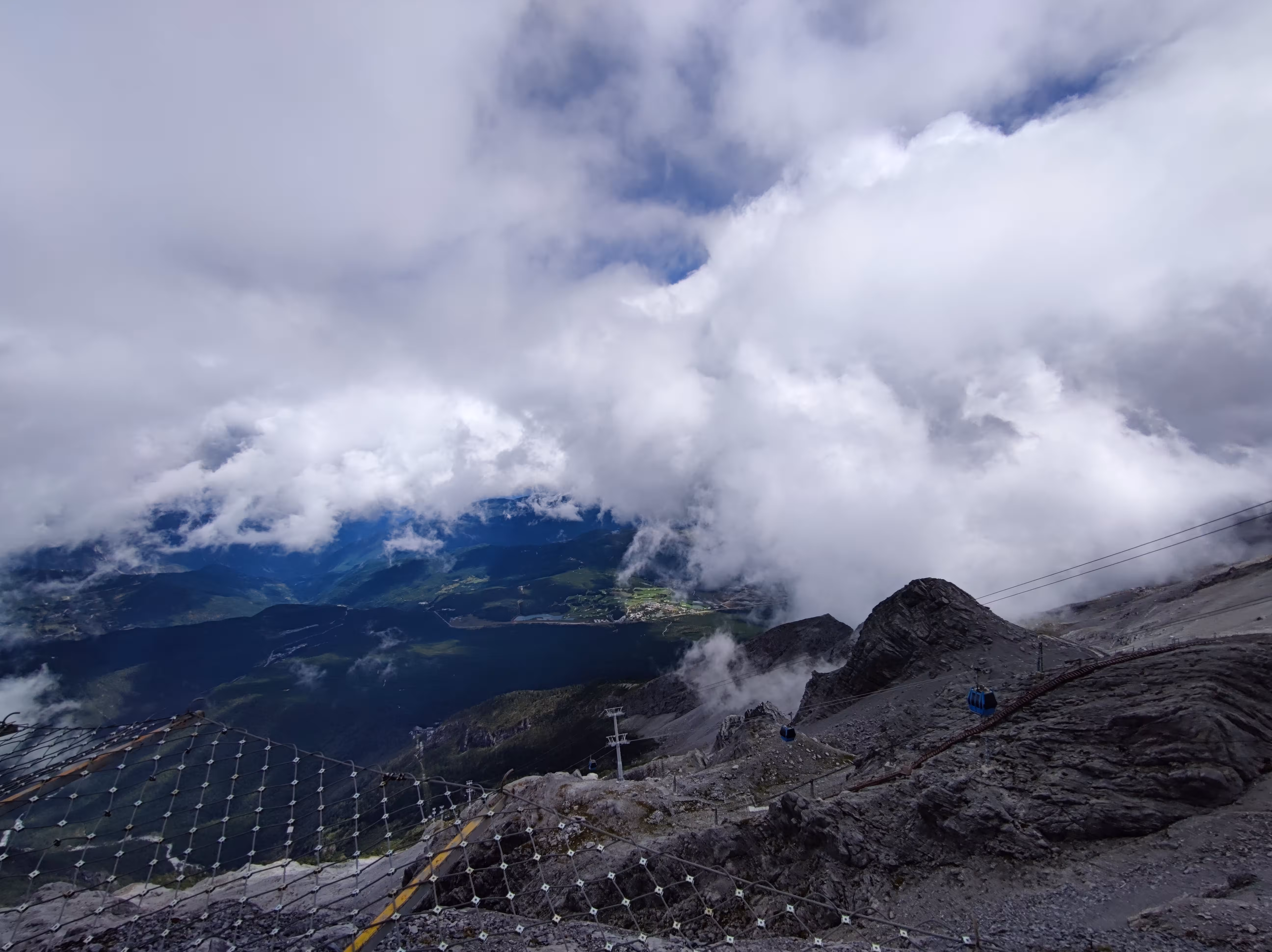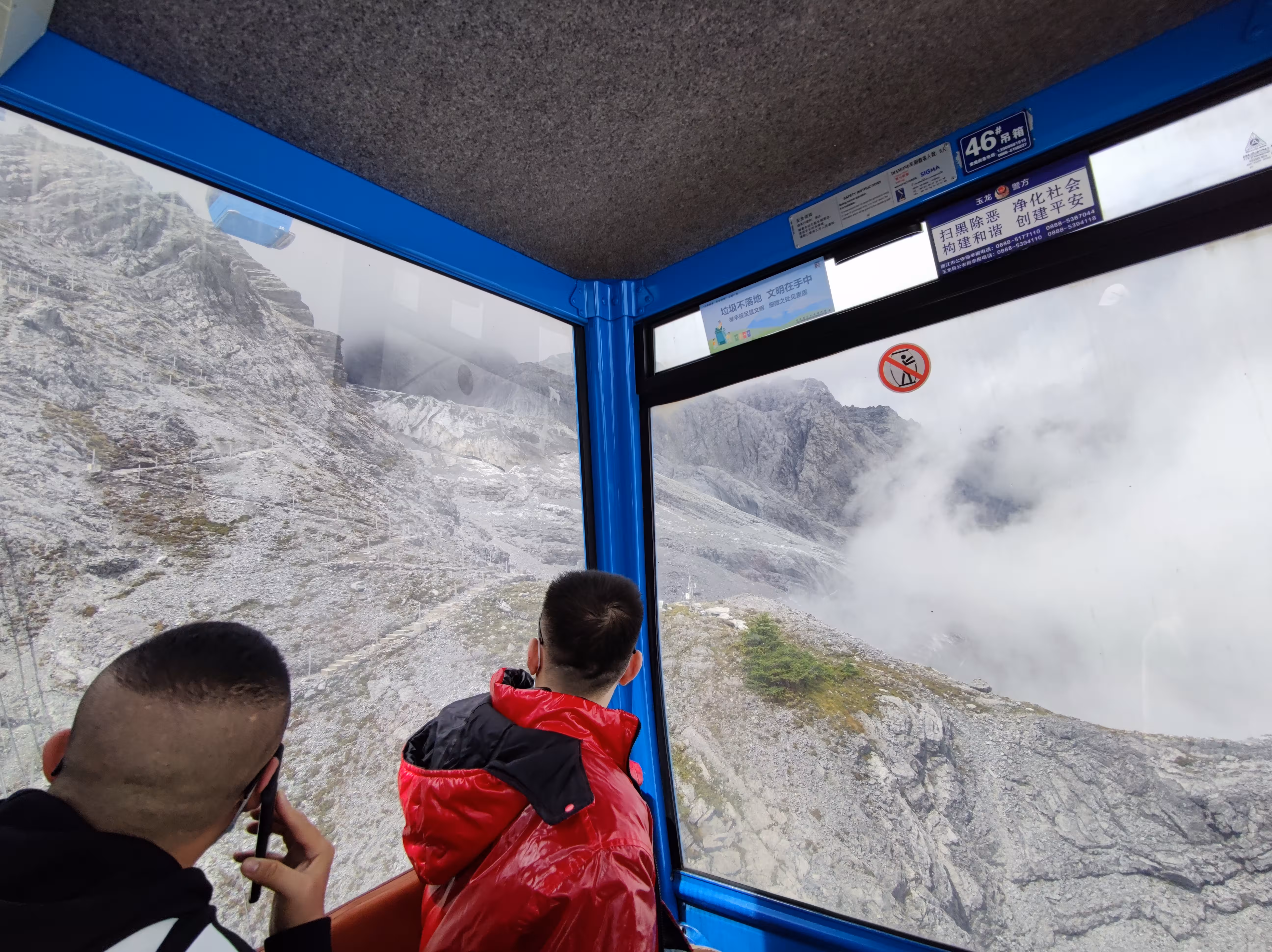 不过害怕这事因人而异,我们隔壁的一对情侣是男生怕得闭上了眼睛,反倒是他对象一直喊他睁眼看看。索道的后半段已经云雾缭绕,窗外什么都看不清,直到接近光秃秃的雪山。