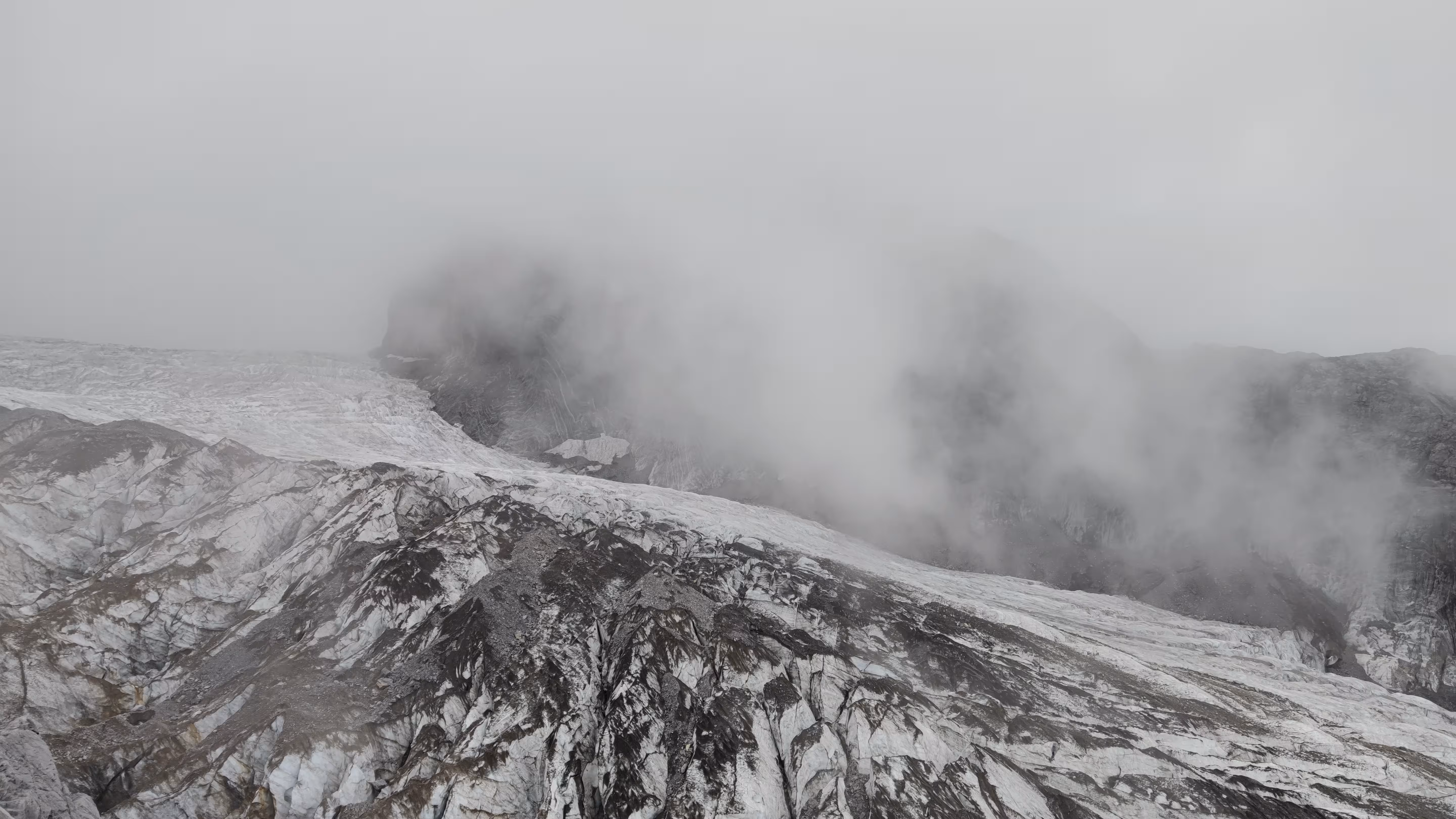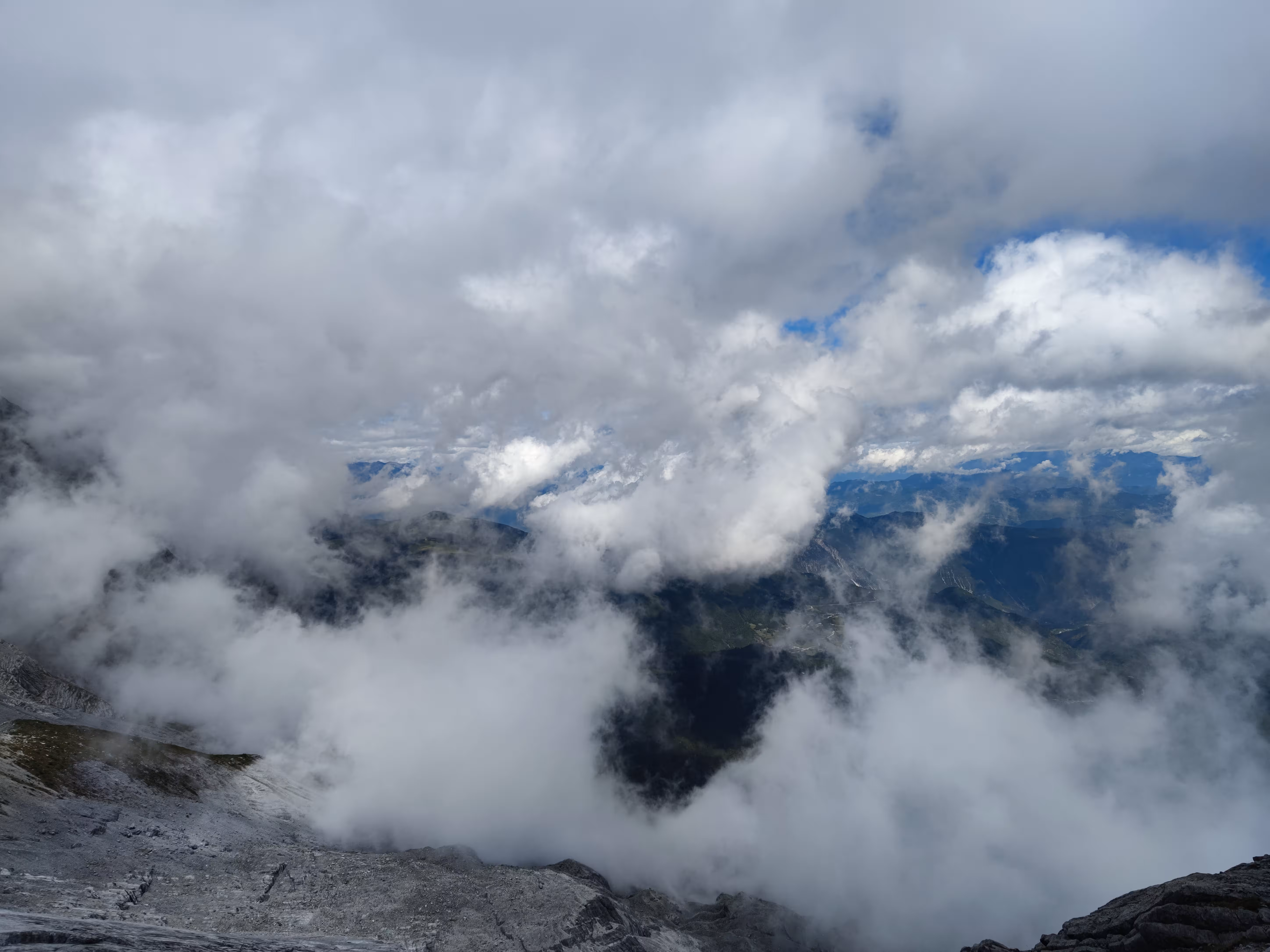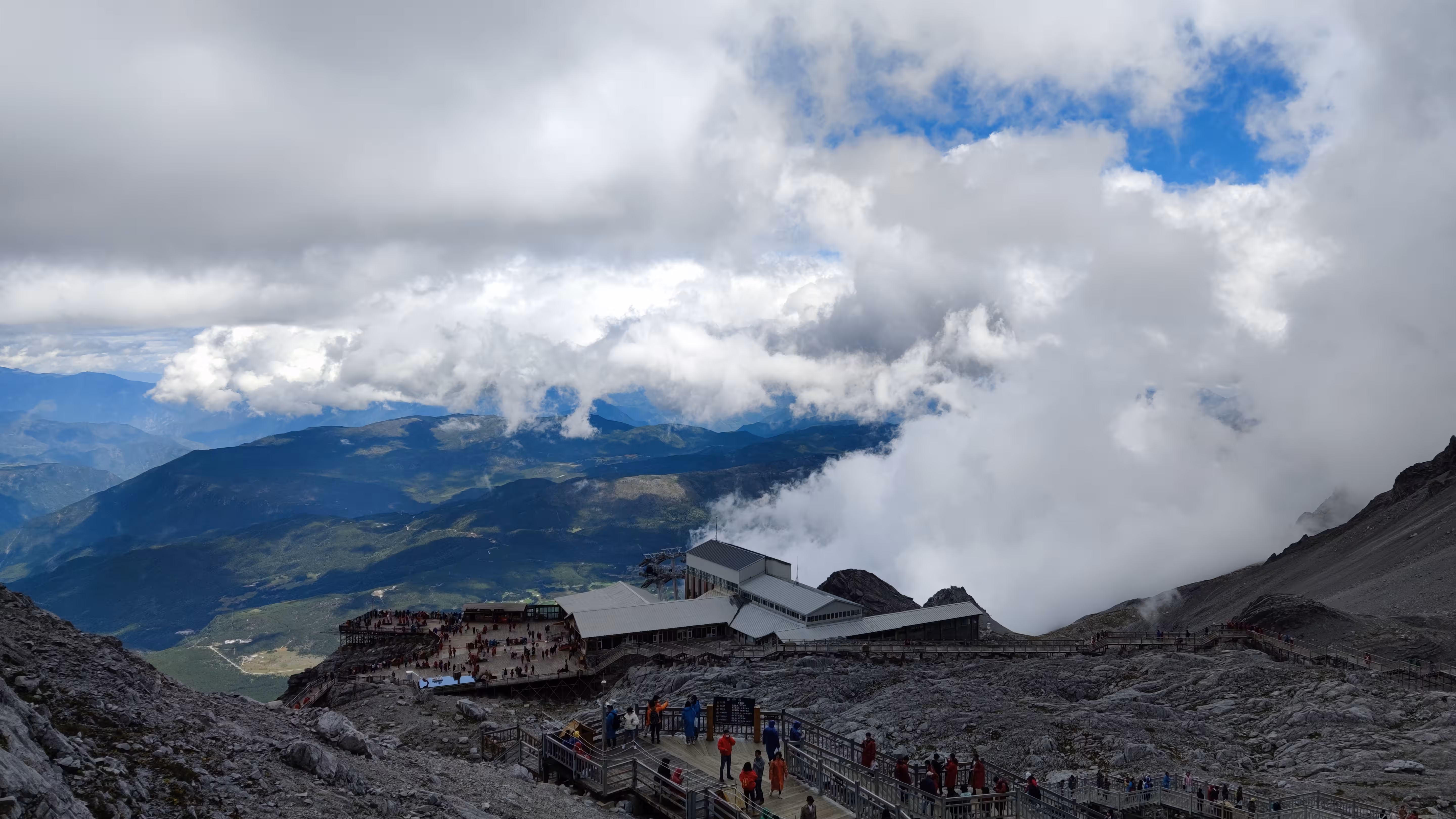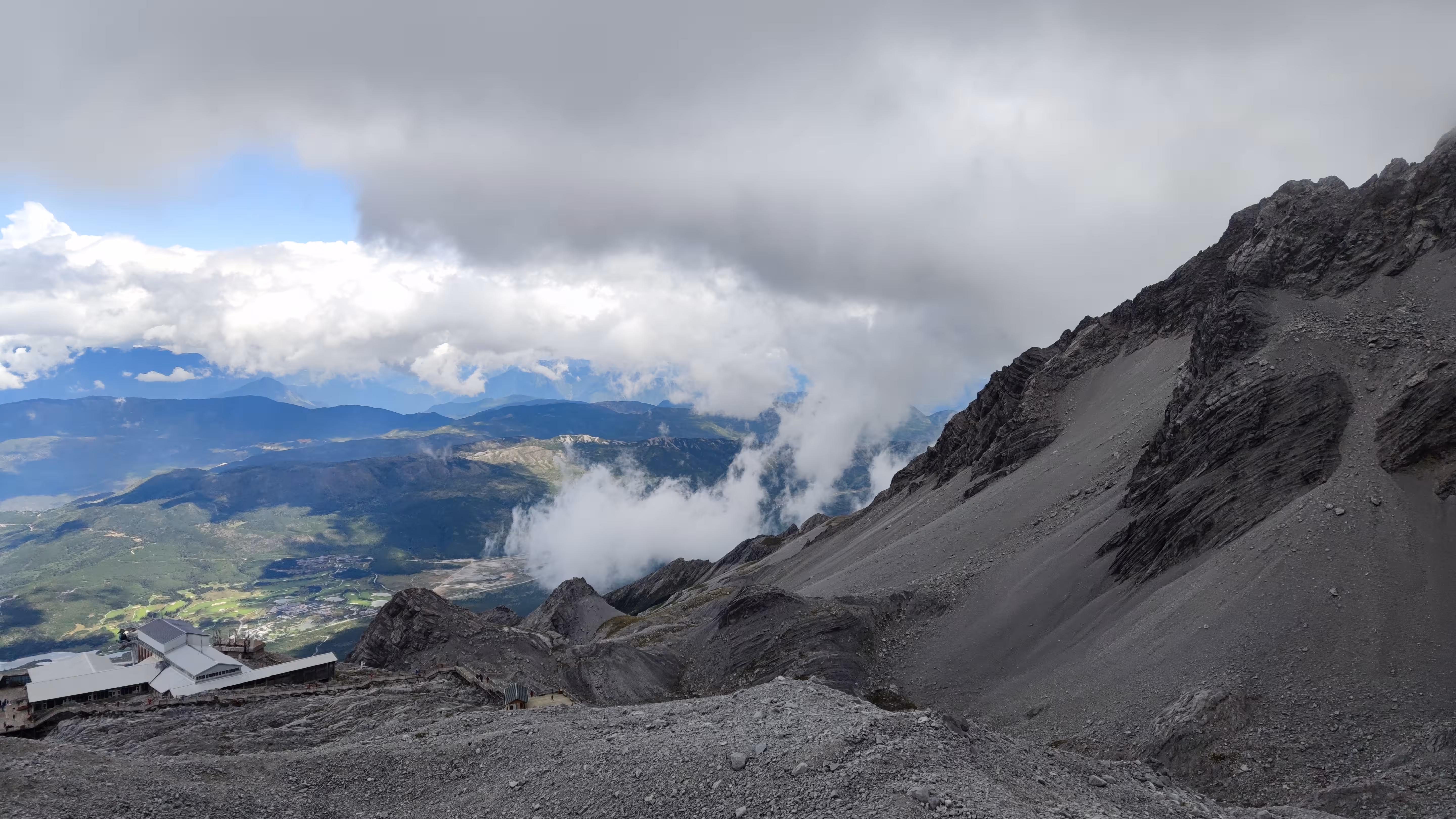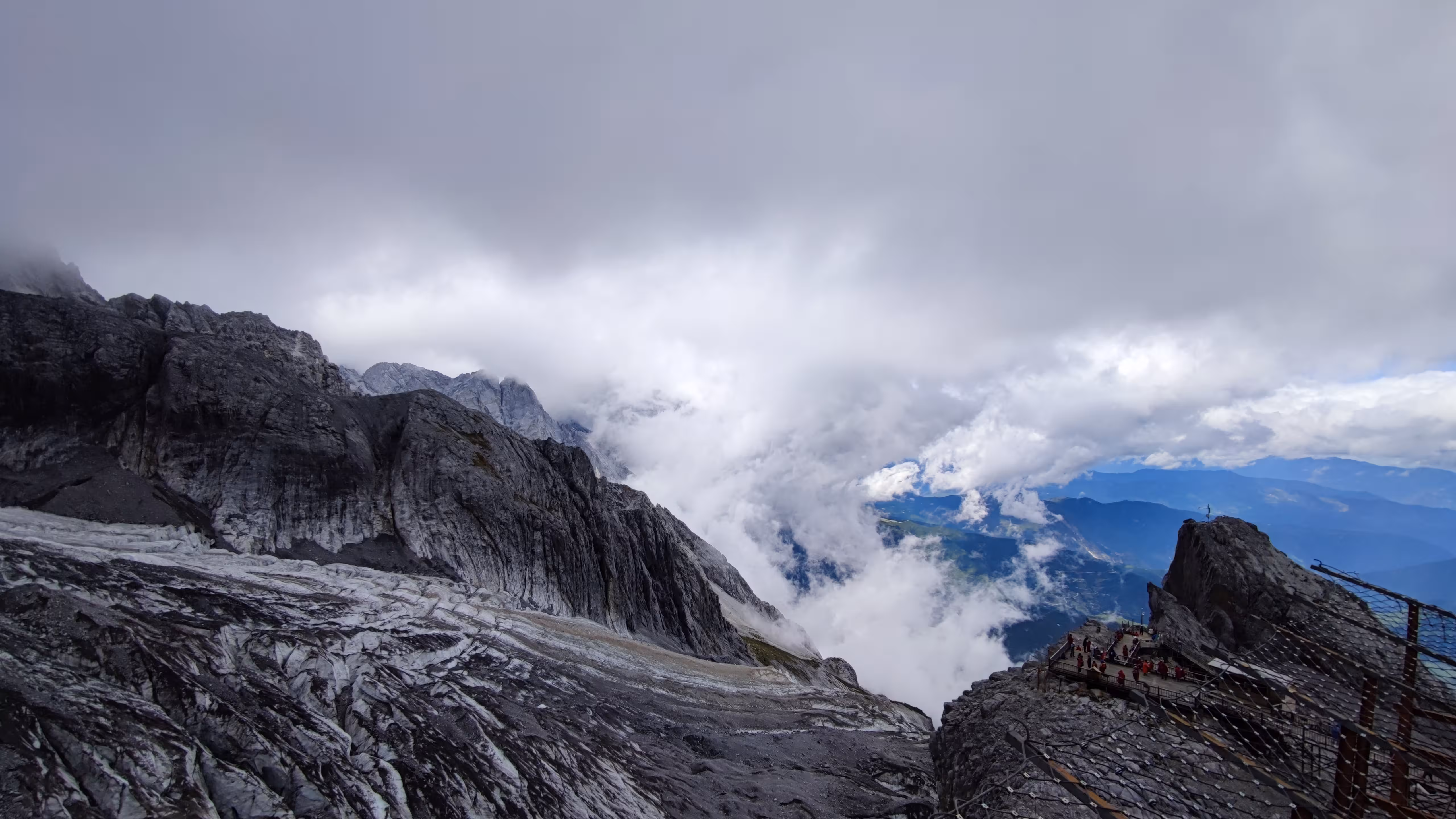 不过害怕这事因人而异,我们隔壁的一对情侣是男生怕得闭上了眼睛,反倒是他对象一直喊他睁眼看看。索道的后半段已经云雾缭绕,窗外什么都看不清,直到接近光秃秃的雪山。