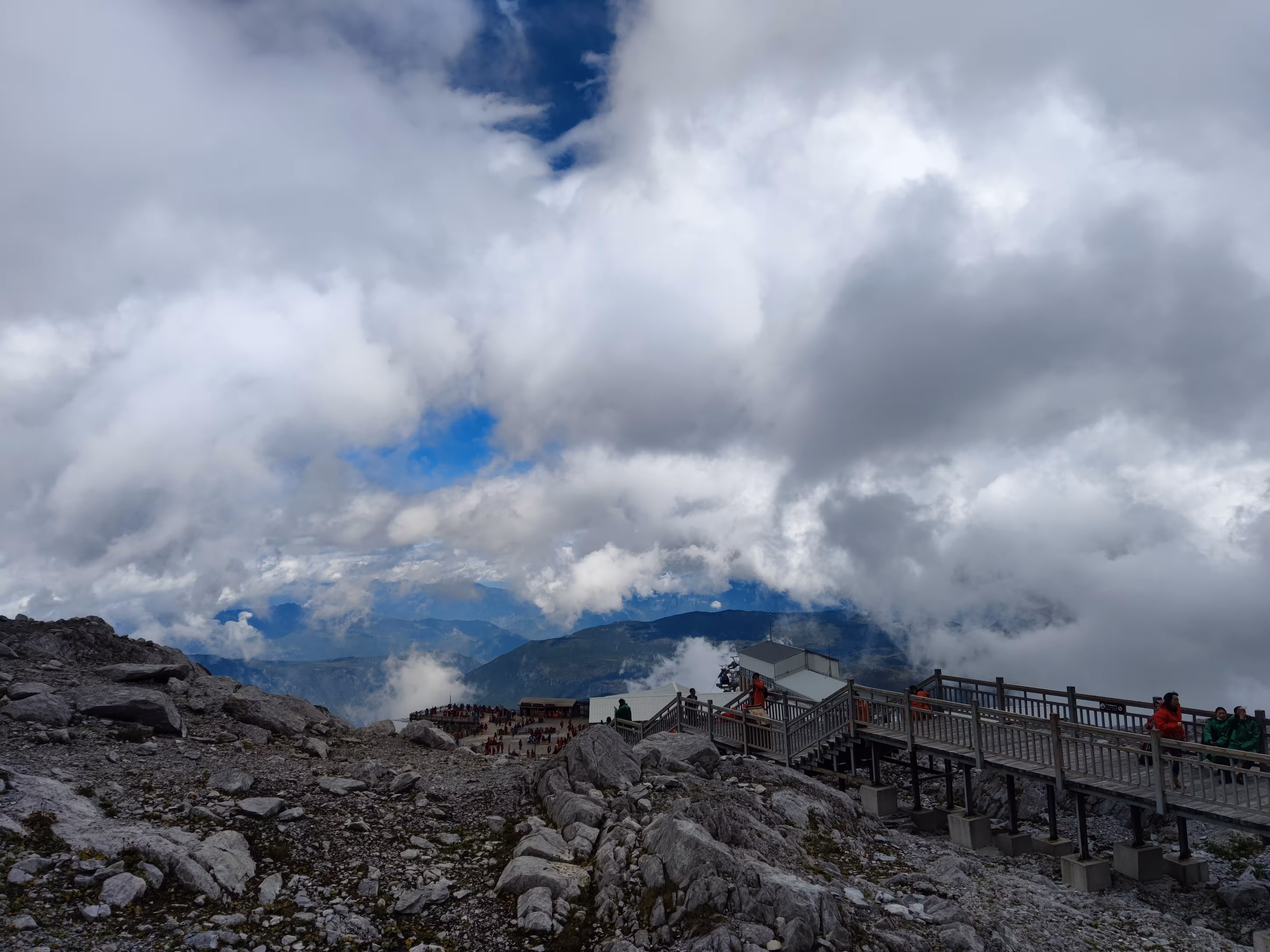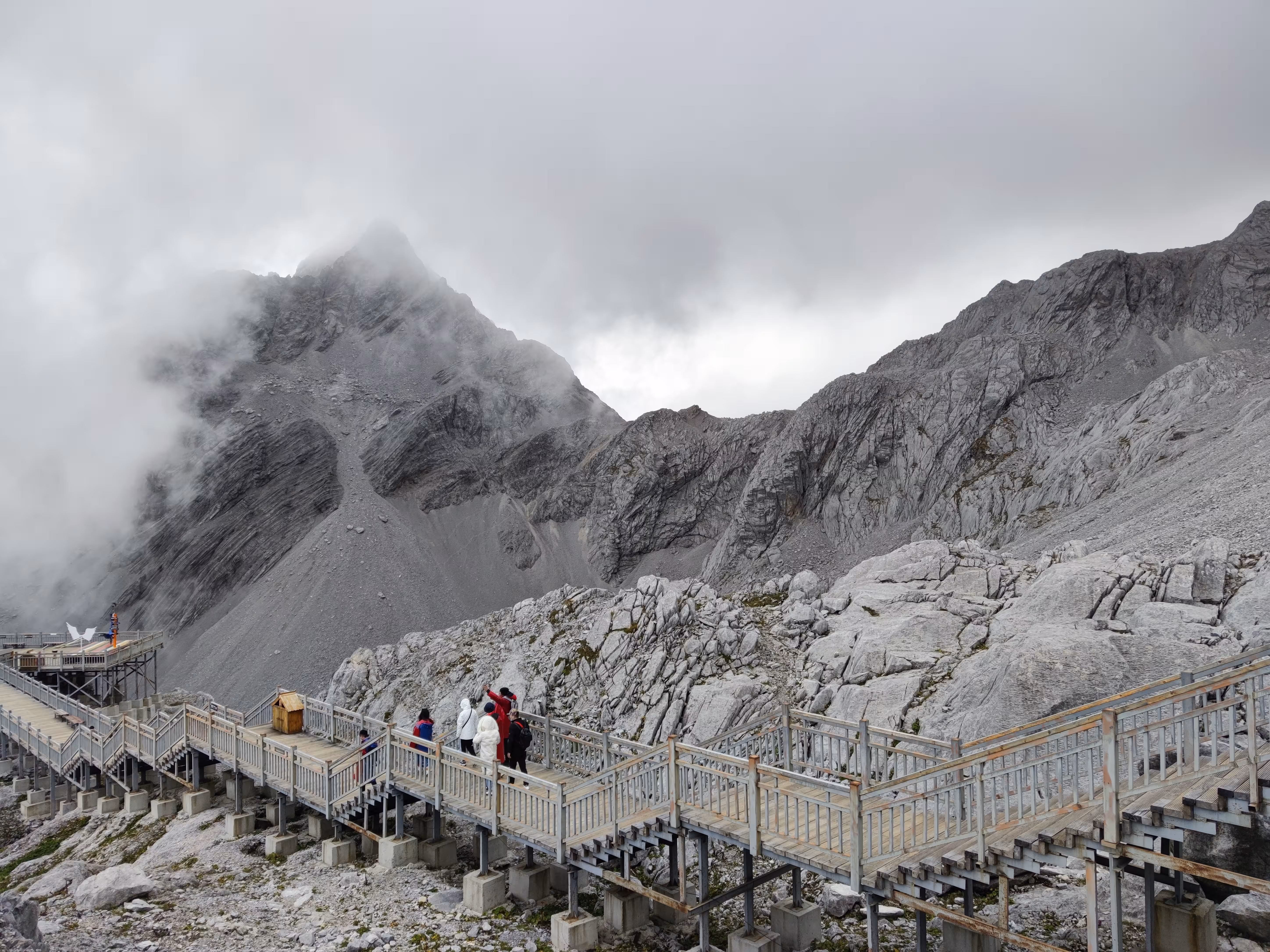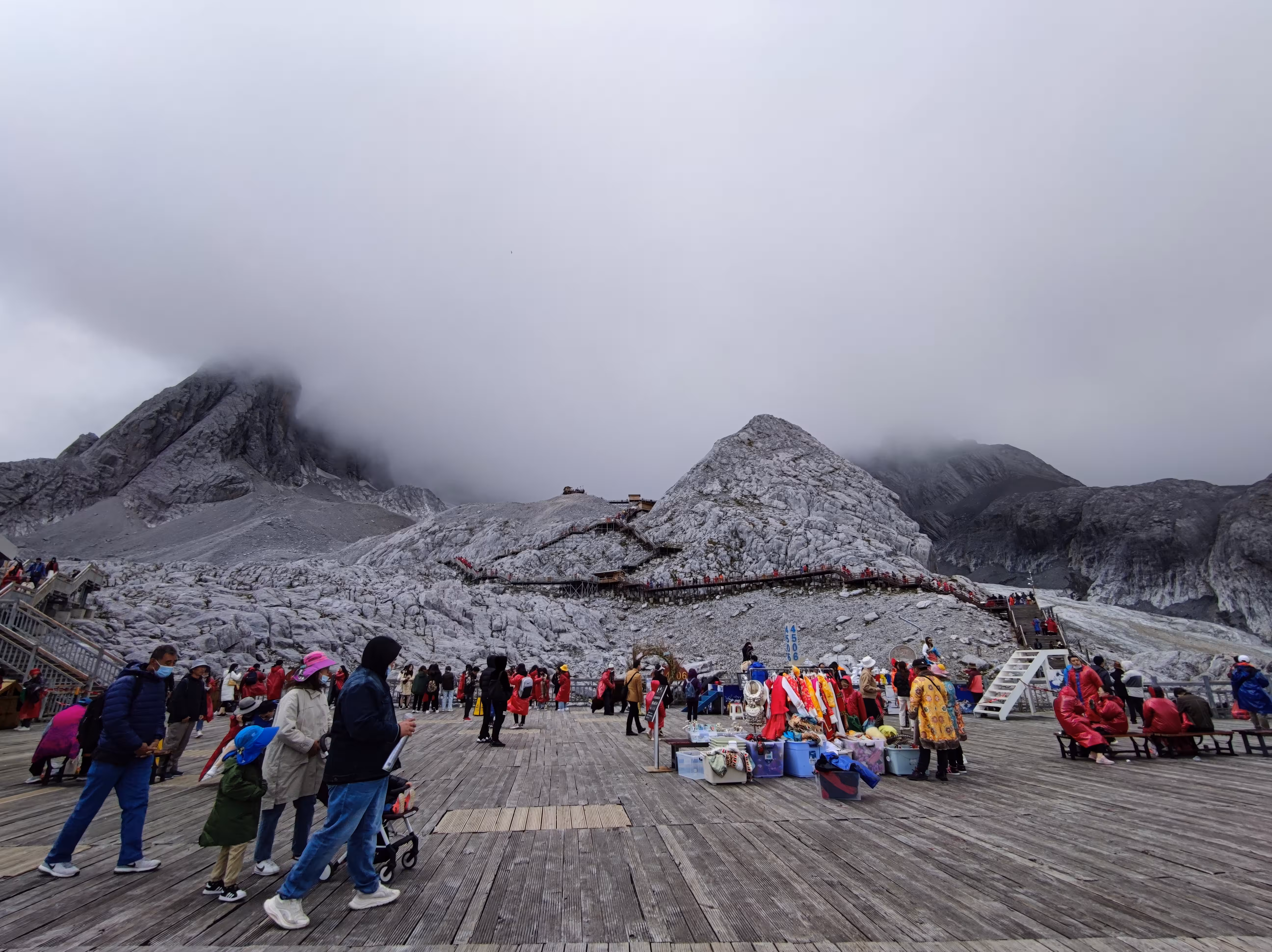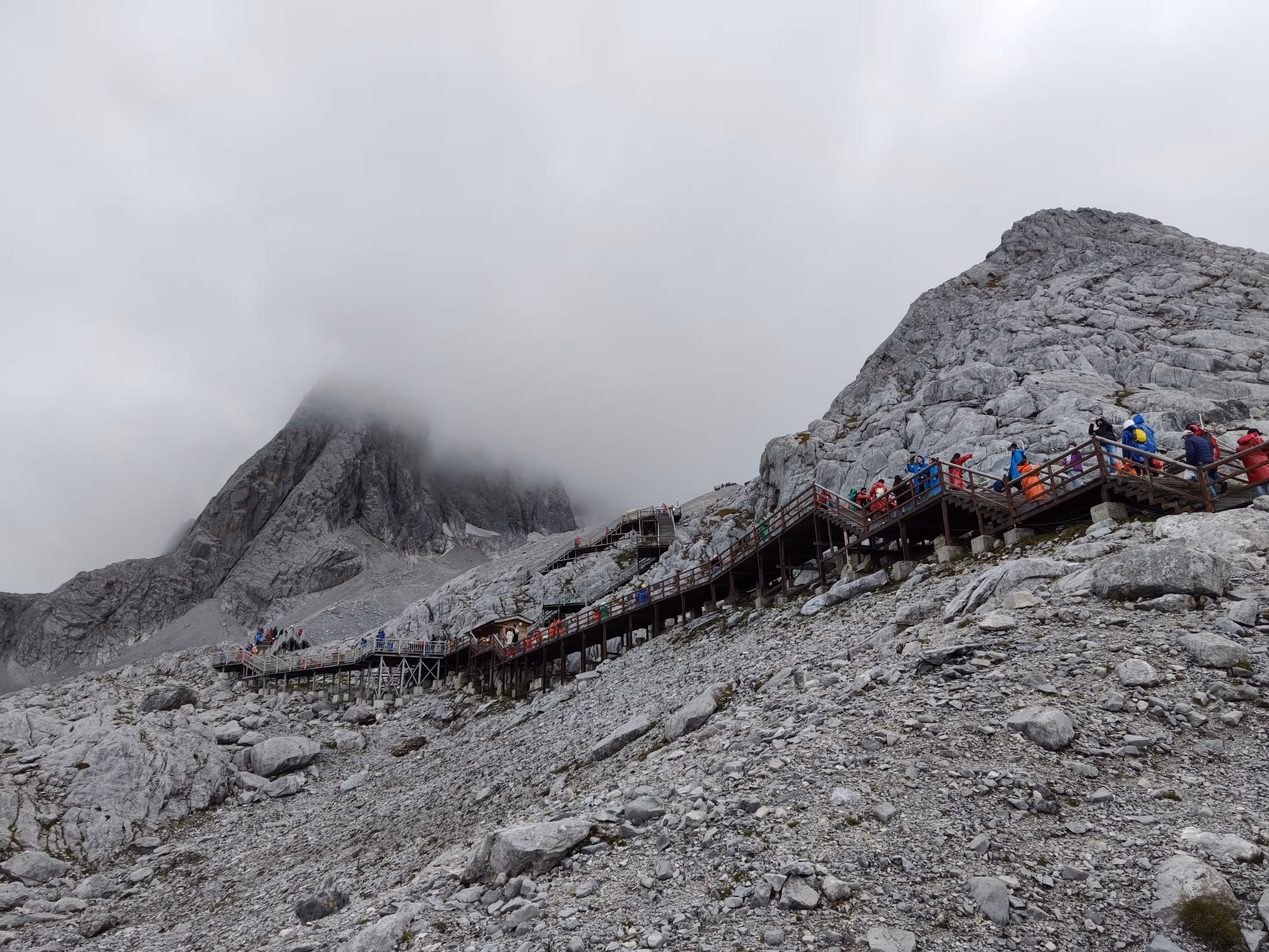 前一天了解到九月底的雪山还没有雪,温度也不是很低,我便只穿了短袖T恤套一件厚绒外套上去。事实证明静止不动时还是有一点冷,爬山则刚刚好。出了索道出口这边的游客中心,就到了登山的大平台,海拔4506米。望向玉龙雪山允许游客攀爬的终点觉得并不远,等到实际爬起来才发现并不容易,每一步上升的海拔高度都仿佛在对渺小的人类说“到此为止吧”。有些年纪大的老人确实没上去,就在平台上拍拍照、转悠一下。