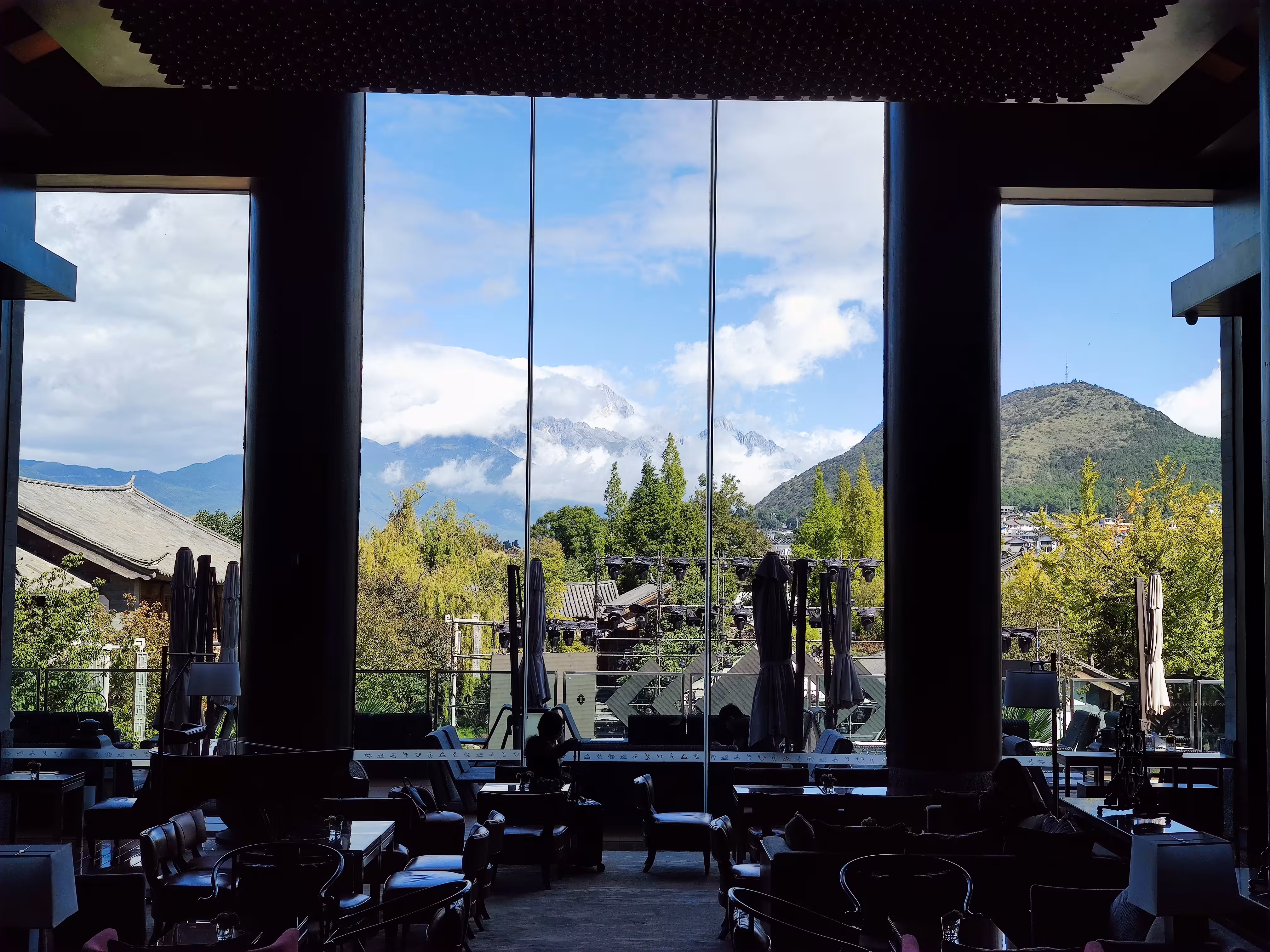 当然酒店内视野最好的观景点,同时也是酒店著名的打卡点之一,便是大堂中央的酒廊。犹抱琵琶半遮面的雪山远景如同一幅壁画镶嵌在巨大的落地窗上。